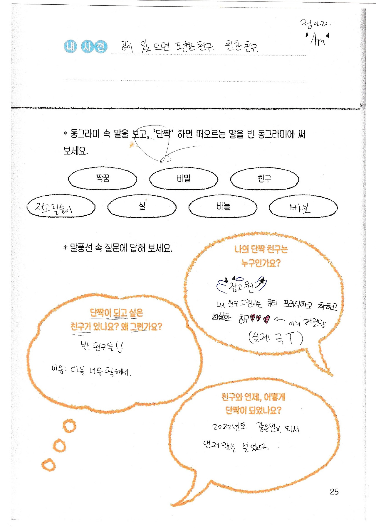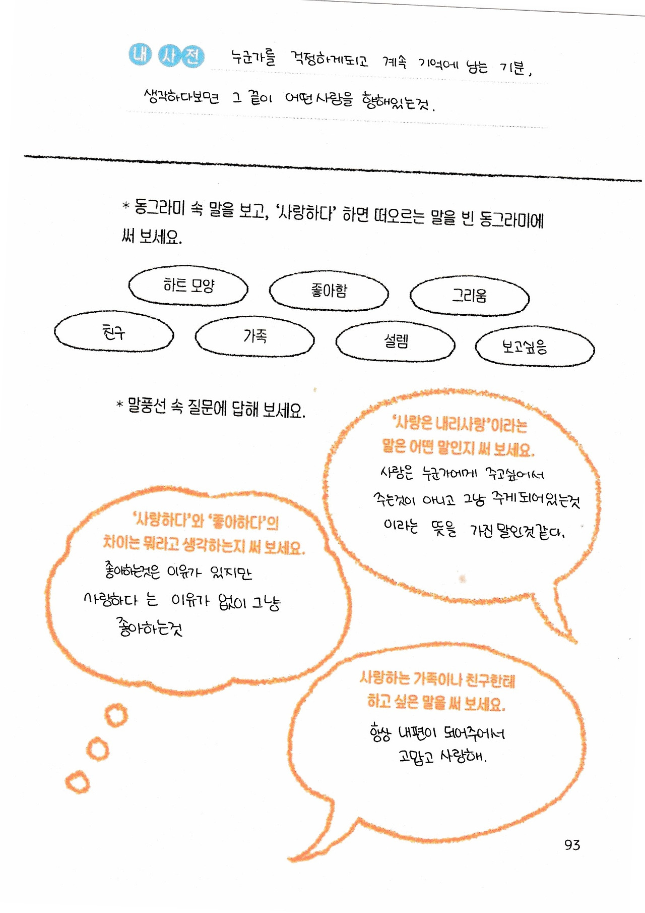 '단짝'하면 떠오르는 '바보'라는 단어에 미소가 나고, '벚꽃'을 던지며 싸움하겠다는 아이를 생각하며 웃었어요. '사랑하다'를 고른 중학교 2학년 아이는 '누군가를 걱정하고 계속 기억에 남는 기분, 생각하다 보면 그 끝이 어떤 사람을 향해 있는 것'이라고 써서 마음 깊이 따뜻하고 행복했습니다.