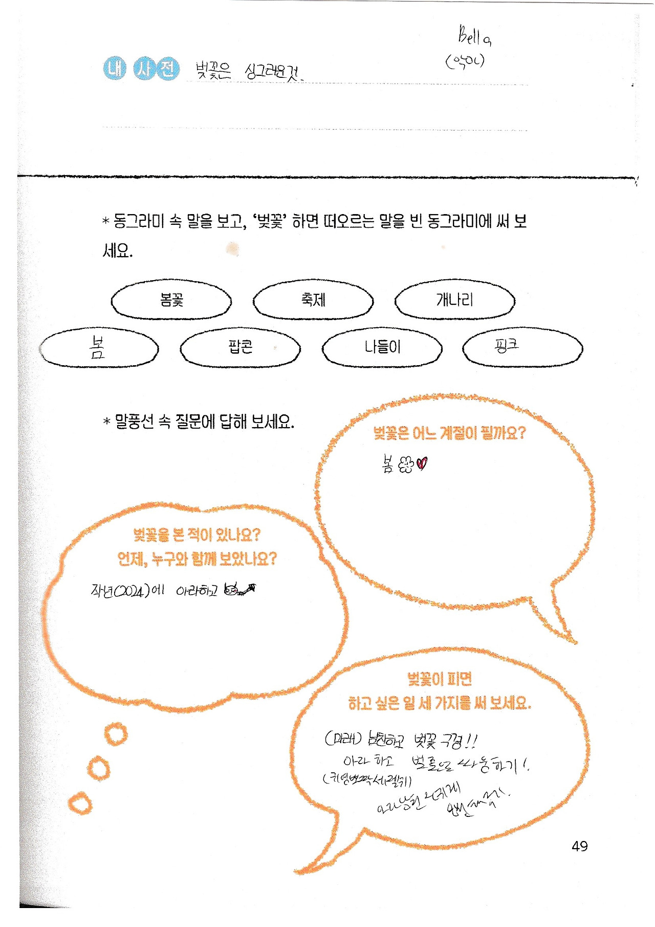 다섯 아이 각자 마음에 드는 단어 하나씩 골랐어요. 아니 그런데 제일 어린 친구가 고른 단어가 '인생'이라뇨. 하하! 단짝, 별, 벚꽃, 인생, 사랑하다, 예쁜 단어들이 벌써 상상력을 자극합니다.