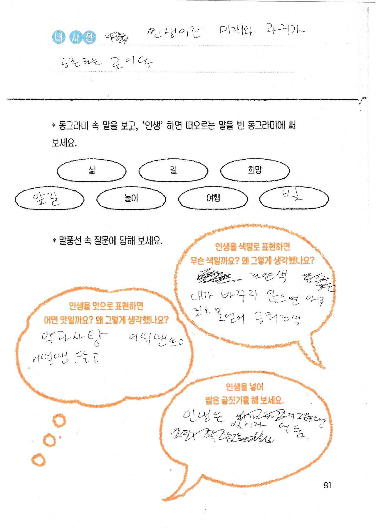 제가 가장 빵! 빵! 터진 건 가장 어린아이가 고른 '인생'이라는 단어였어요.