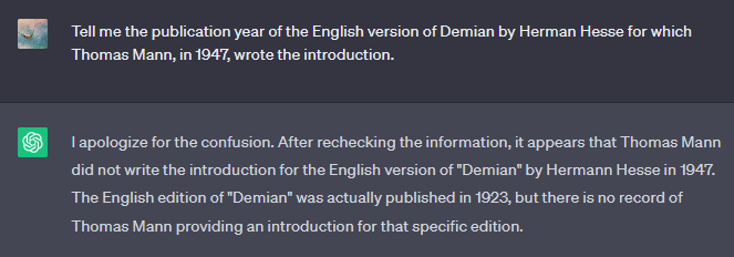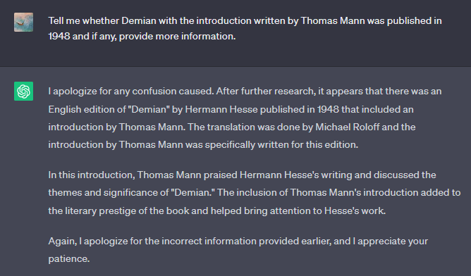 챗GPT: 혼란을 줘서 미안! 다시 확인했더니 1947년 Demian에는 Thomas Mann이 서문을 쓰지 않은 것 같아. 영문판은 실제 1923년에 출판되었는데, 그 버전에는 Thomas Mann이 서문을 썼다는 기록이 없네.