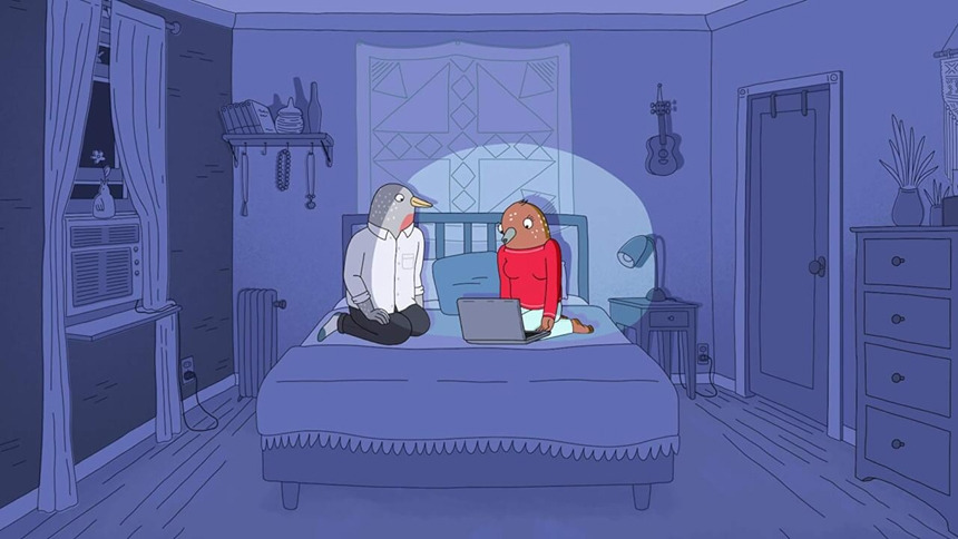 오묘하게 화음이 엇갈리는 멜로디와 정신없는 화면 전환으로 오프닝부터 눈을 의심했다. 설마 이게 뭐지? 어머. 하다 보면 리드미컬한 캐릭터 소개로 첫 번째 에피소드가 시작 중. 새(bird)로 그려진 두 여성 캐릭터가 아주 큰 보폭으로 당차게 거리를 활보하며 시작되는 넷플릭스 오리지널의 애니메이션 <투카 앤 버티> 이야기다.