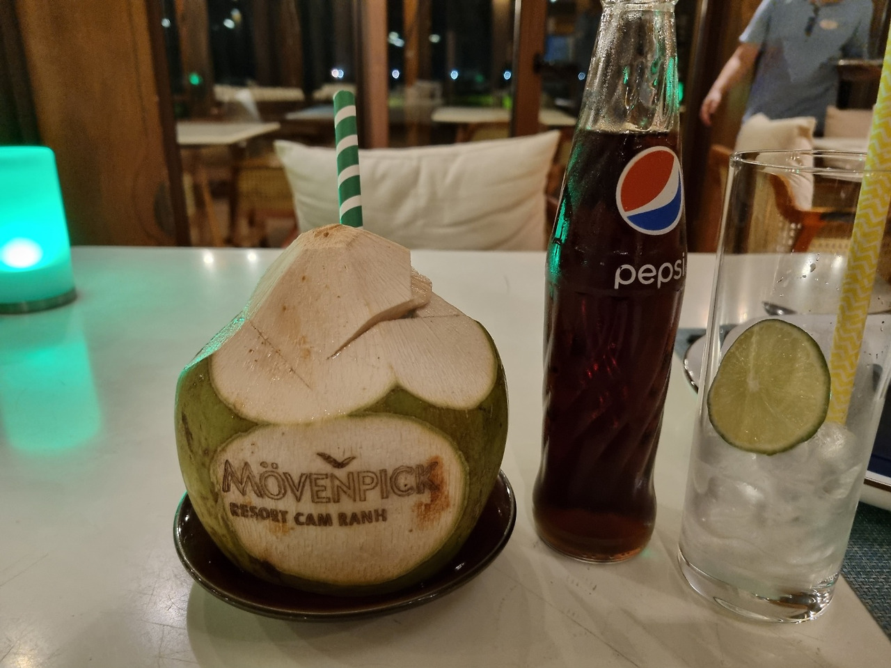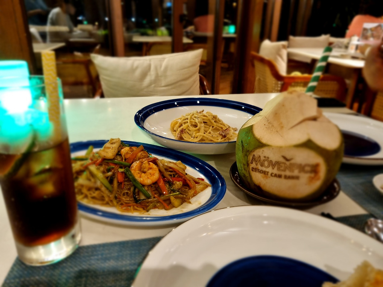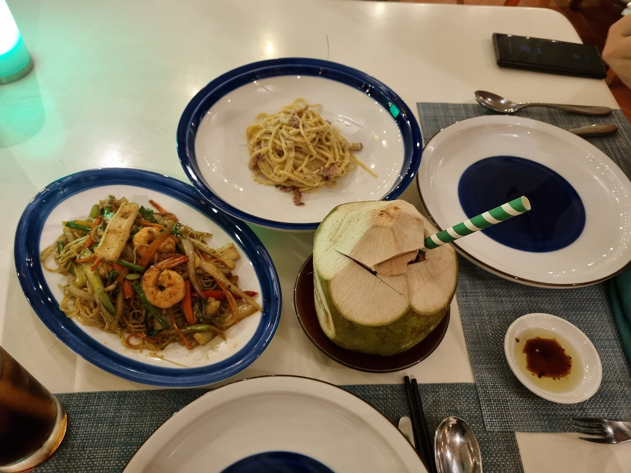 숙소에서 좀 떨어져 있는 2번째 레스토랑인 트로피카나를 호텔 미니카를 타고 우리는 냐짱에서 마지막 저녁을 분위기 있게 보내기로 했다. 호텔 안에서 파는 음식이다 보니 가격은 우리나라 일반 음식점 가격이랑 비슷했다. 하지만, 호텔이란 걸 생각하면 우리나라보다는 훨씬 저렴했다. 짝꿍은 베트남 음식이 안 맞아서 잘 못 먹었어서 스파게티를 선택했고 나는 역시나 현지음식, 미고랭을 택했다. 그리고 빠질 수 없는 코코넛 음료! 포함해서 우리의 냐짱에서의 마지막 만찬을 즐겼다.