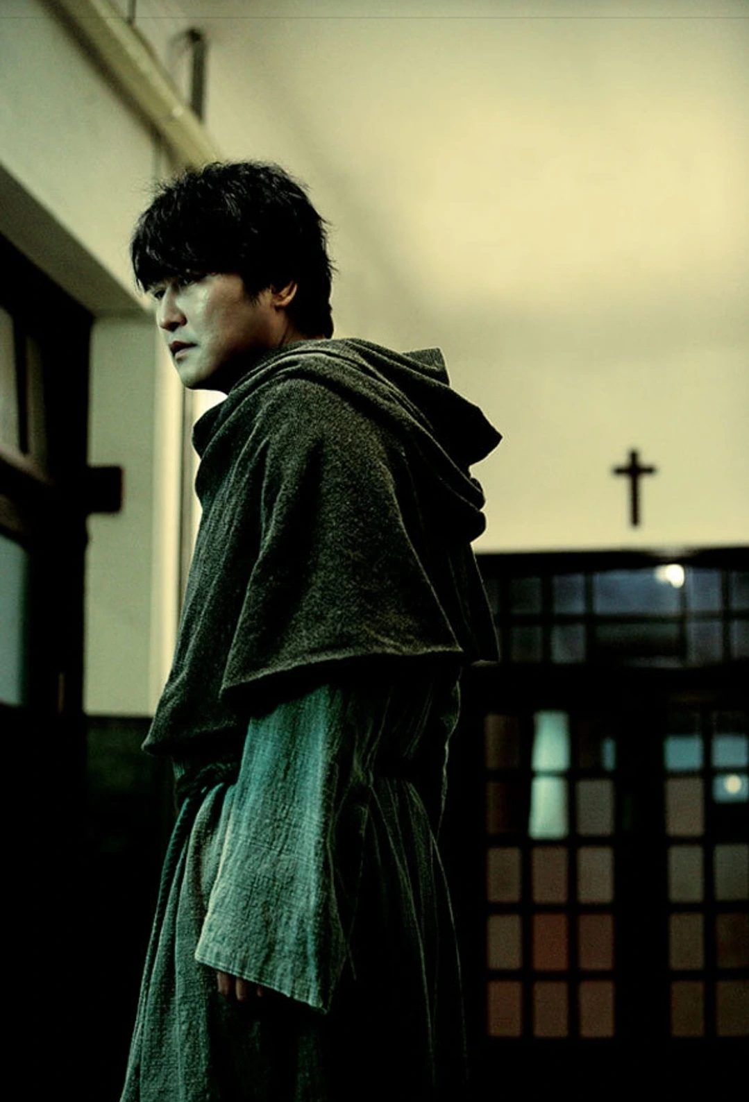인간에게 남몰래 존재하는 타나토스의 욕망을 보여주기 위해서, 영화에선 ‘신부’를 필두로 세운다. 주인공 ‘상현’(송강호)은 박애사상이 가득한 신부로, 병원을 돌아다니며 아픈 환자들을 위해 기도를 해주고 그들에게 힘이 되어준다. 그는 독실한 기독교인으로서 사람들은 그를 절대적으로 믿고 찬양하였다. 어디가 아프거나, 죽을 위기에 처해 있거나 등 힘든 일이 생길 때마다 사람들은 ‘상현’을 찾아온다. 그는 그들에게 땅에 잠시 내려오신 신과 다름없었다. 이는 나중에 ‘상현’이 흡혈귀가 된 후에도 계속 그러는데 이게 참 아이러니하다. 좋은 일을 하러 의료실험에 참여했다가 흡혈귀가 된 ‘상현’. 결국 그는 자신의 갈증을 위해 환자의 손을 잡고 기도를 해주면서 환자의 피를 핥는다. 환자의 피를 빨아먹으며 누워있는 그의 모습과 그럼에도 불구하고 여전히 그를 추앙하는 사람들을 보여주면서 영화는 아이러니를 극대화한다.
