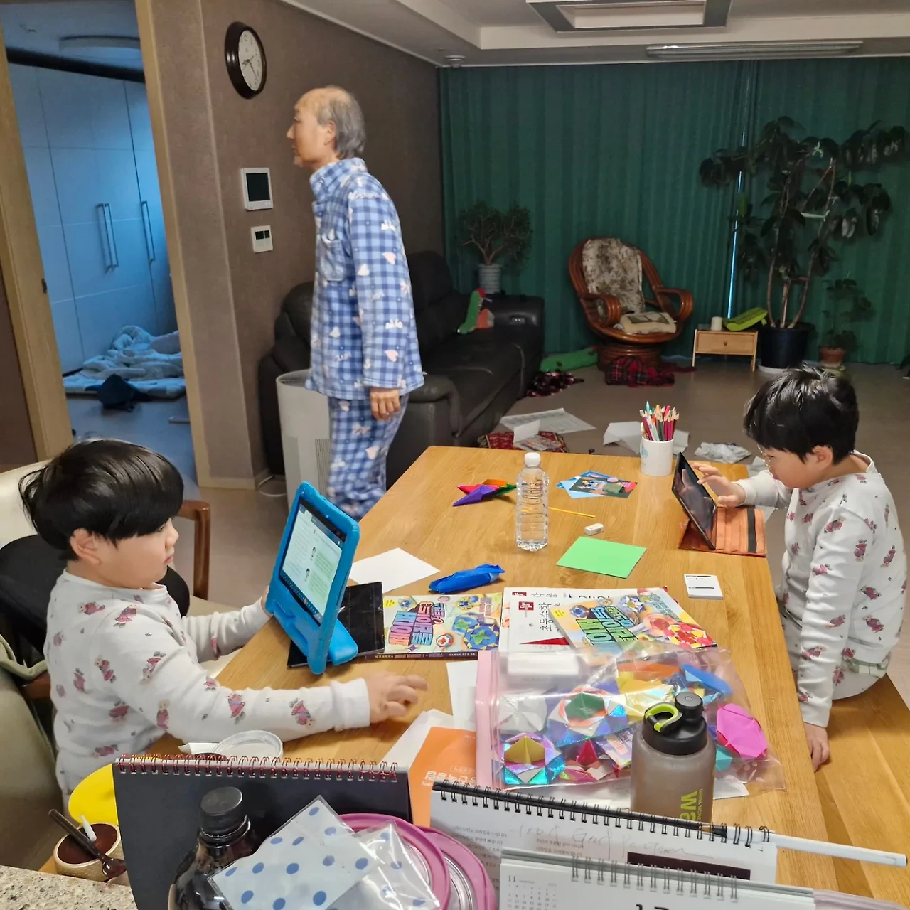"해중아. 너도 같은 생각이야? 이모 늦잠자도록 놔둬?"