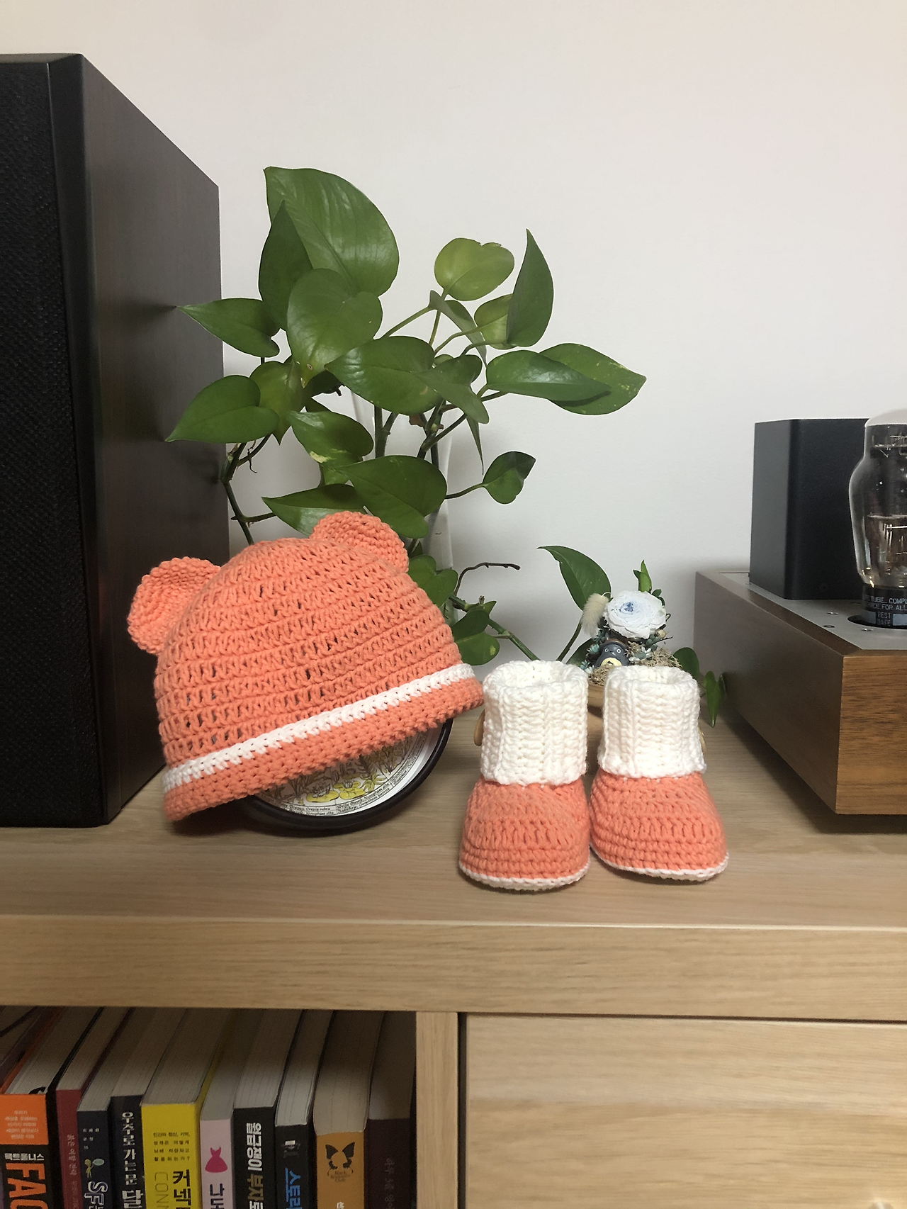 모자와 신발을 뜬 실은 사실 내가 몇 년 전에 뜨개질을 해보려고 사뒀던 실이다. 모티브 한 번 만들고 몇 년 보관하다가 최근 이사하고서 다시 눈에 띄었으나 영 안 쓸 것 같아서 어머님을 드렸는데, 뭔가 사부작사부작 하시더니 만들어주셨다. 내가 산 실로 만들어서 더 의미 있다며.