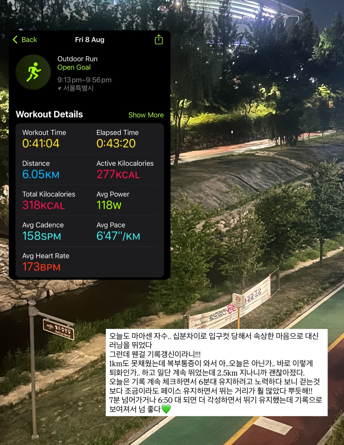 운동을 할 때 작은 성취를 바로 느껴나가며 나에 대한 뿌듯함이 올라가는 것도 좋았다. 러닝은 나랑 맞지 않다고 생각했었는데 어느 날 5km를 뛰고, 다음 번엔 6km를 더 빨리 뛰는 것을 보면서 나도 할 수 있다는 자신감이 생겼고, 올초엔 수영 25m도 숨차하던 내가 1,000m를 50분에 기록하게 되는 것을 보면서 그런 성취들을 내 하루의 동력으로 삼았다. 서류 탈락 메일을 받는 것은 매번 고통스러웠지만 이런 눈에 보이는 작은 성취들이 나 자신에 대한 확신을 붙잡아주는 끈이 되었다.