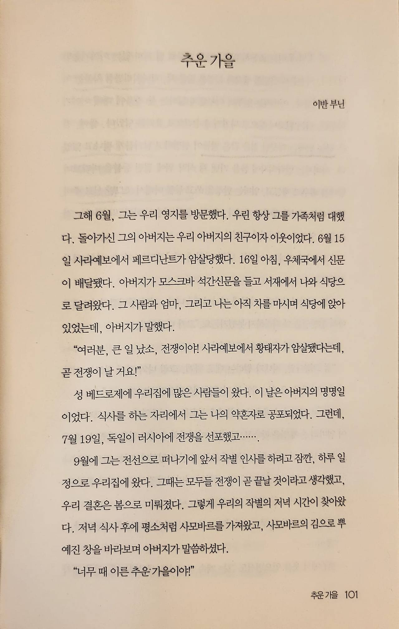 이반 부닌의 <추운 가을>은 사랑하는 약혼자를 전쟁터에 떠난 보낸 후 영원한 이별을 겪는 여인의 슬픔을 그린 소설이다. 그녀는 약혼자를 전쟁으로 잃은후 30년을 부족한 산소를 나눠 거친 숨을 몰아쉬는 이별의 삶을 살아간다.