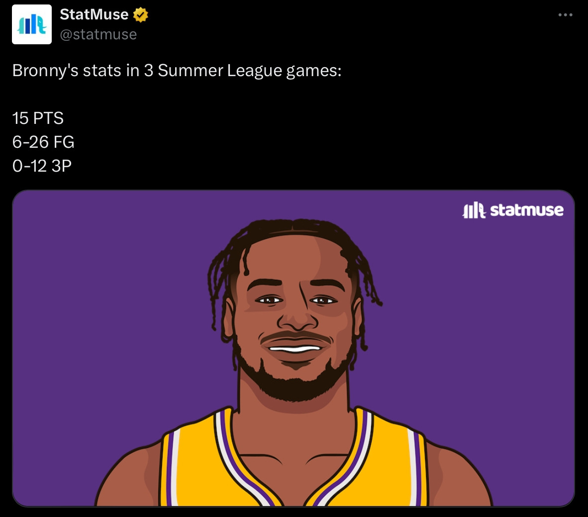 다시 브로니 제임스 얘기로 돌아가면…2024년 신인 드래프트 2라운드 55 픽으로 레이커스가 일찌감치(?) 그를 지명하면서 NBA 최초로 부자가 한 팀에서 뛰게 되는 새로운 역사를 만들게 되었다. 많은 이들은 르브론 개인의 욕심 때문에 여러 가지를 망쳤다고 말하고 있다. 우리나라였으면 공정과 상식을 운운하며 르브론 퇴출을 외치는 목소리가 컸을 수도 있었겠다만, 듣자 하니 미국 사회는 혈연이나 학연을 기반으로 한 특혜가 생각보다는 관대하게 받아들여진다고 한다. 하지만 그것을 차치하고서라도, 브로니 제임스가 농구 선수로서 NBA에 입단할 만한 수준의 실력을 갖춘 선수가 아니라는 점 때문에 레이커스와 르브론에 대한 비판을 지나친 것으로 보지 않고 다들 쉽게 의견을 피력하고 있는 것 같다는 느낌이다. 그리고 현재 진행 중인 섬머리그에서 보는 브로니의 모습은 그러한 비판들을 타당한 것으로 만들고 있다. 아버지의 과도한 보살핌 때문에 일찍부터 자신에 대한 부정적인 여론에 시달려야 하고 아버지 때문에 자신을 뽑은 레이커스의 선택이 결코 잘못된 것이 아님을 증명해야 하는 중압감도 상당히 클 것이란 생각도 든다.