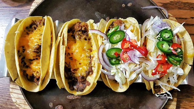멕시칸 타코의 경우 고기를 조리할 때, 갈은 고기를 이용해 푹 찌거나 볶은고기를 이용하며, 텍스-멕스는 마켓에서 판매되는 타코 시즈닝으로 앙념한 닭고기나 돼지고기를 구워서 넣어 먹습니다.