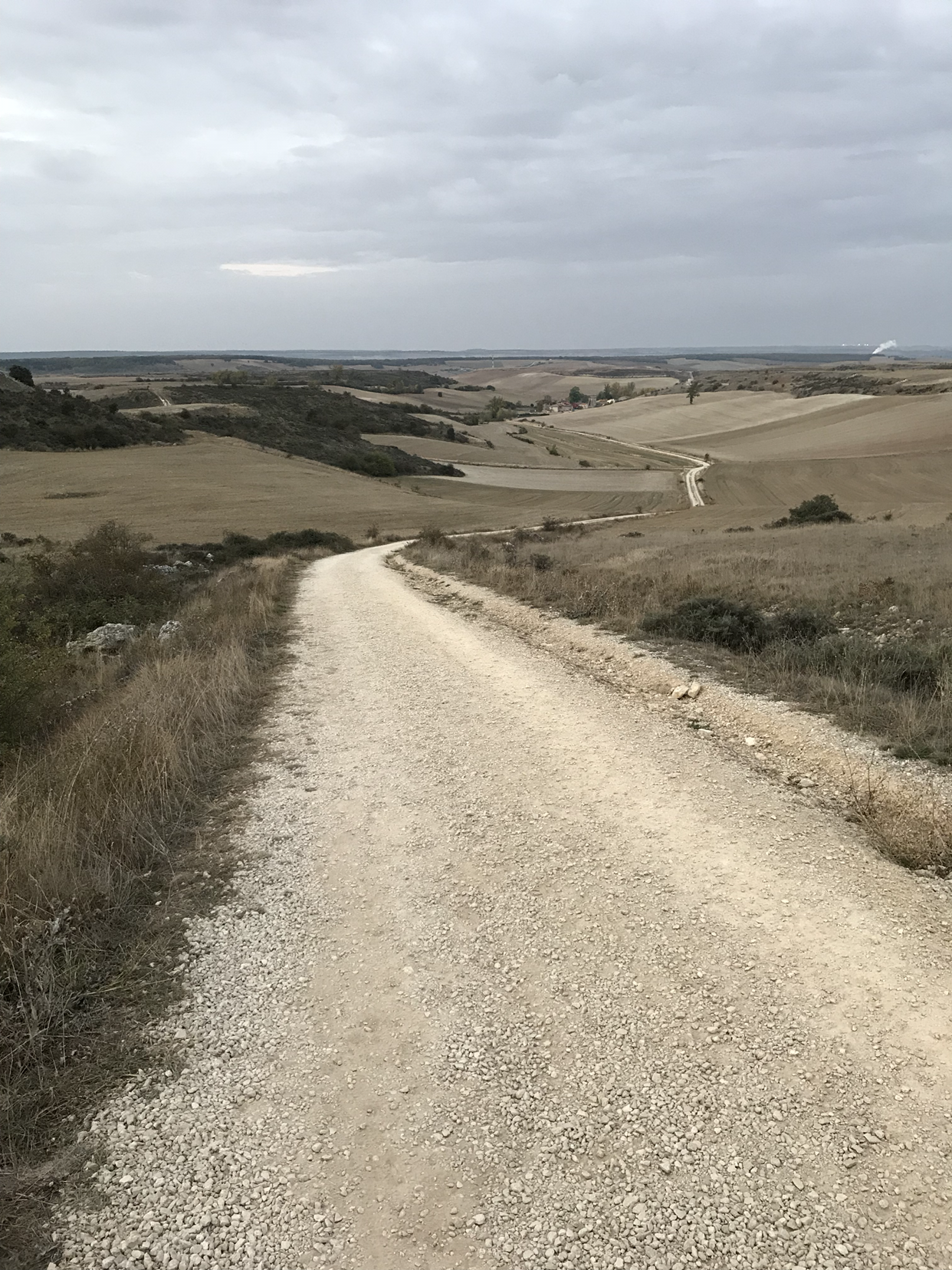 산 내려와 갈림길에서 정식 가리비 표지판은 직진을, 노란색 화살표는 왼쪽을 가리킨다. 난감하다. 앞서가는 사람이 직진하길래 한참을 따라가다 전날 만난 화가 아저씨가 얘기한 게 생각나 바로 다시 되돌아와서 작은 마을 통과하는 왼쪽 길을 택했다. 이 길이 부르고스 공장지대를 관통하지 않는 좀 더 좋은 길이라고 했거든. 길이 구부정한 게 이쁘다. 아침도 먹을 수 있겠다.
