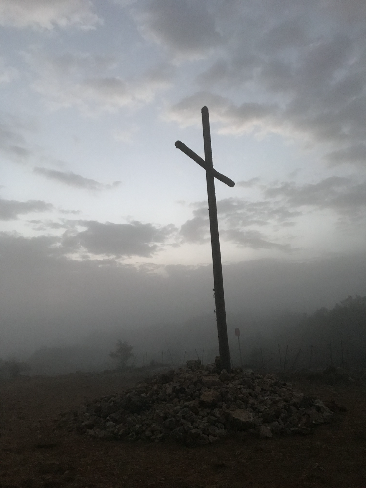 안개 너머 보이는 정상의 십자가, 새벽의 스산함과 짙은 안개로 인해 신비로워 보인다. 안개가 왜 안 개나 했는데 산 너머는 안개가 한 개도 없다. 라임 어떤가? ㅎ