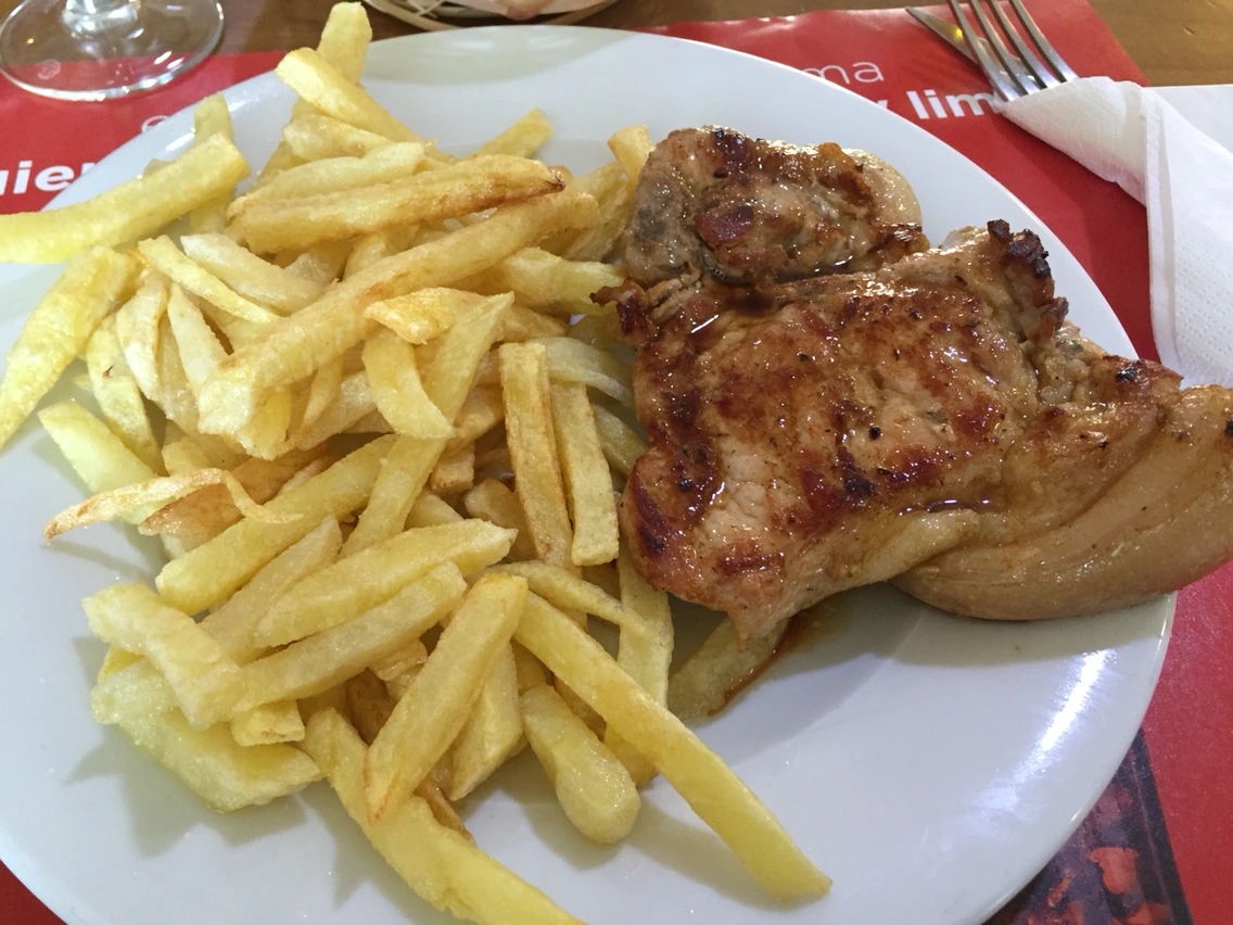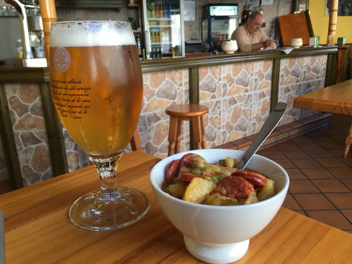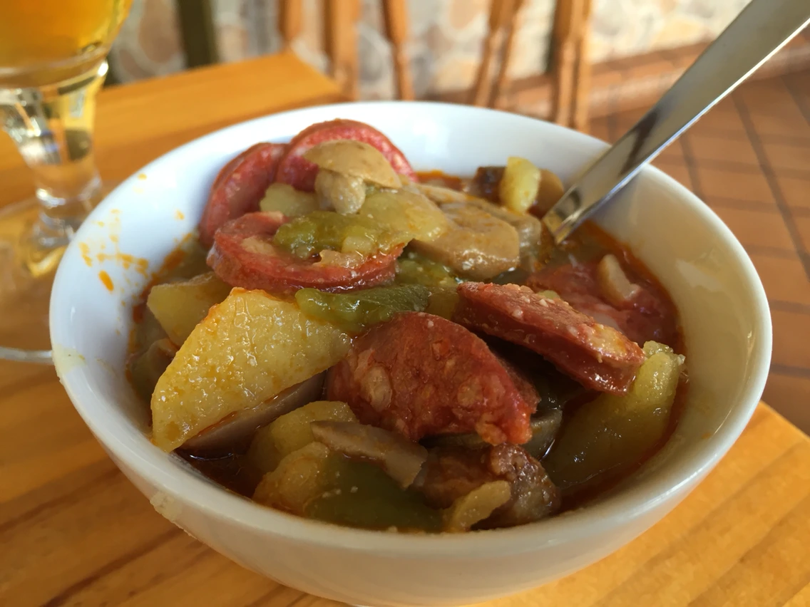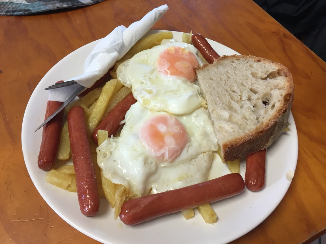 오늘은 두 시간을 걸어오니 카페가 보인다. 스페인식 브런치 메뉴가 여럿 보인다. 그중 계란 프라이 2개, 소시지 7개가 삶은 감자 위해 올려져 있는 것이 5유로(7천원 정도). 싸다.