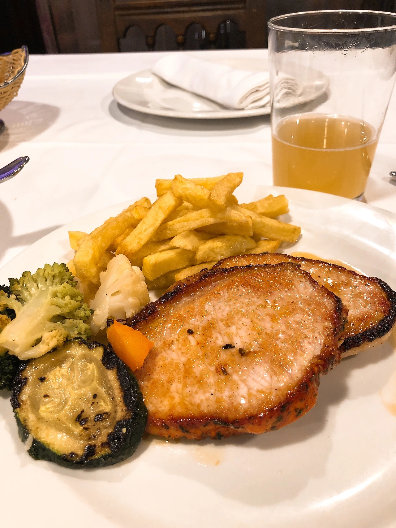 샤워 마치고 레몬 맥주 원샷하다. 순례자 메뉴로 나온 풍성한 샐러드와 스테이크로 배를 채우다.
