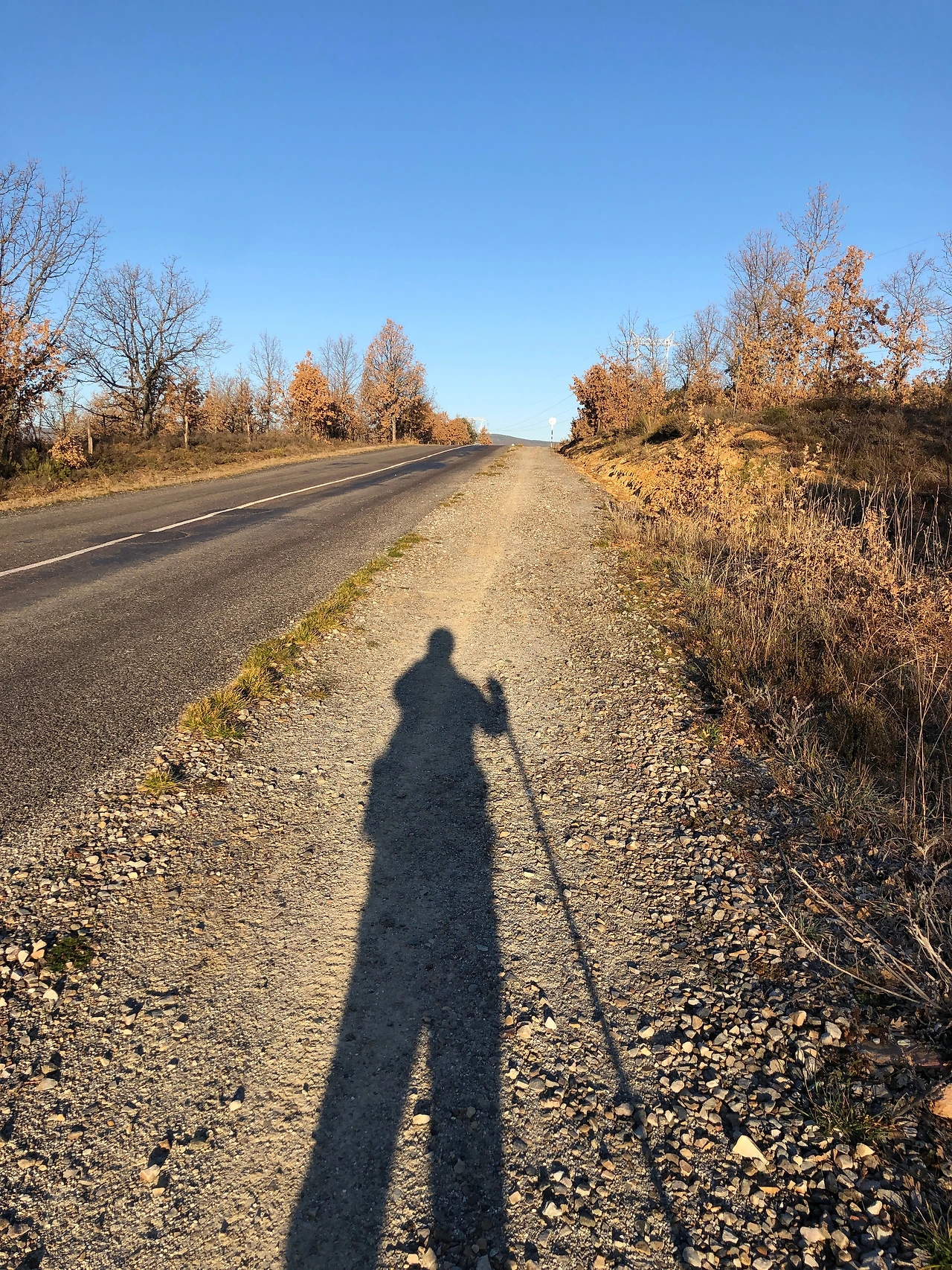 도로 옆 길을 걷다. 살짝 오르막 길에서 뒤에 떠오르는 태양으로 인해 그림자가 비친다. 내 그림자.