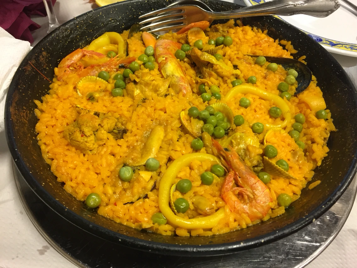 양이 푸짐하게 나왔다. 약간 양념도 되어 있어 짭짤 고소하다. 또 와인이 속을 달래준다. 와인 역시 신이 만든 최고의 선물이다. 그래서 주님이라 부르는지도. 잠시 후 나온 빠에야도 예술이다. 해물과 노란색 물이 든 빠에야. 드디어 산티아고 와서 처음 먹어본다.