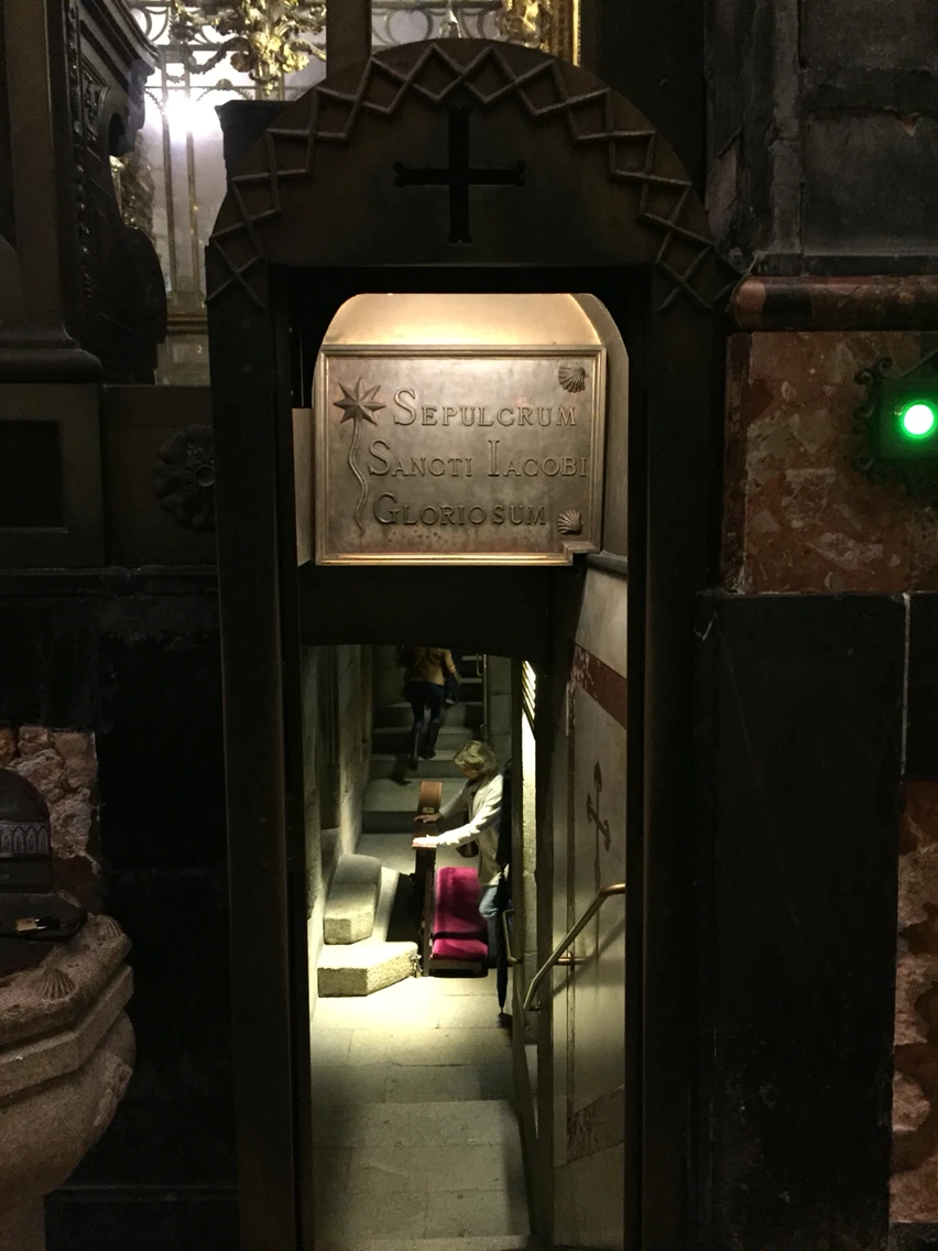 마침 옆에 박물관 안내직원이 보였다. 물어보니 예배당 주 제단 바로 아래 있단다. 감사하다고 말하고 다시 예배당을 찾았다. 가서 보니 아까 지나쳤던 곳이다. 내가 본 'Juan Pablo'는 야고보를 추앙한 다른 분 이름인 것 같다. 다시 보니 입구에 이렇게 적혀 있었다. 'Sancti Iacobi'라고 적혀 있는 것이 아닌가?
