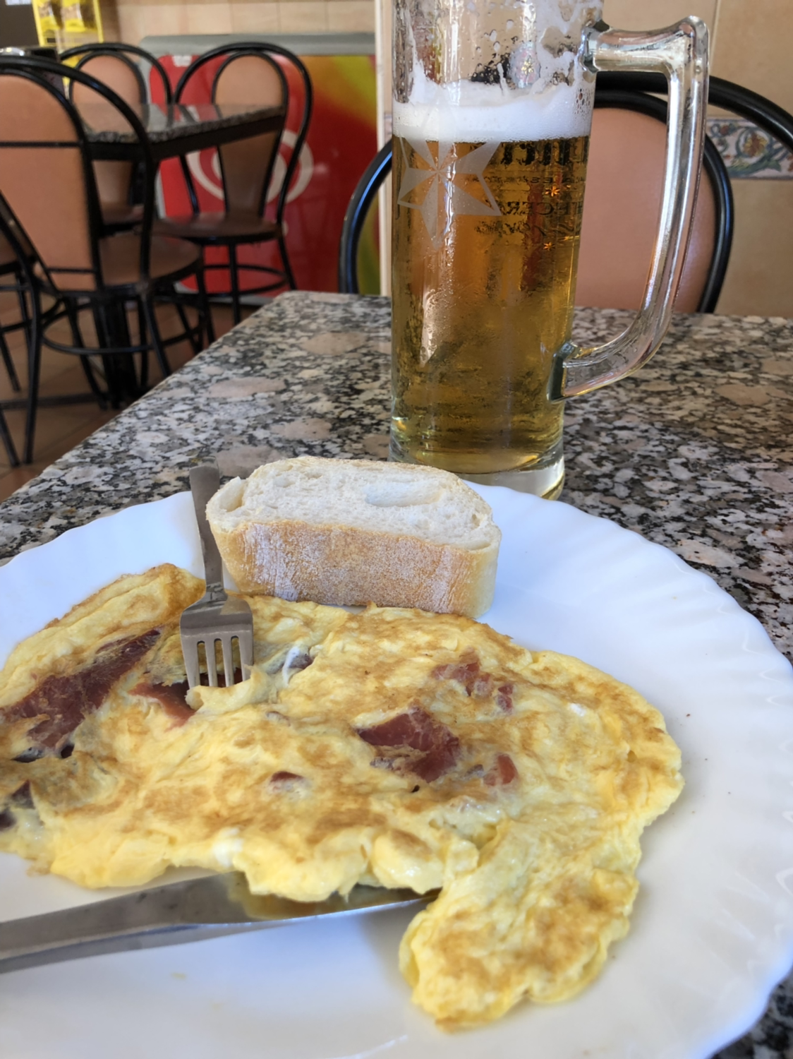 11:58 원래 가려던 마을인 깜뽀나라야 전에 있는 마을에서 그만 맥주의 유혹에 넘어가다. 그래 여기서 한잔 하고 가자. 누가 쫒아오는 것도 아닌데. 15.55 킬로 옴. 거의 절반을 왔다. 아자. 맥주와 하몽 곁들인 오믈렛을 먹다. 바로 해서 따뜻하니 맛난다. 양이 좀 적어서 아쉽지만. 그래서 아침에 못 먹은 에스프레소와 도넛을 더 시켰다. ㅎㅎ