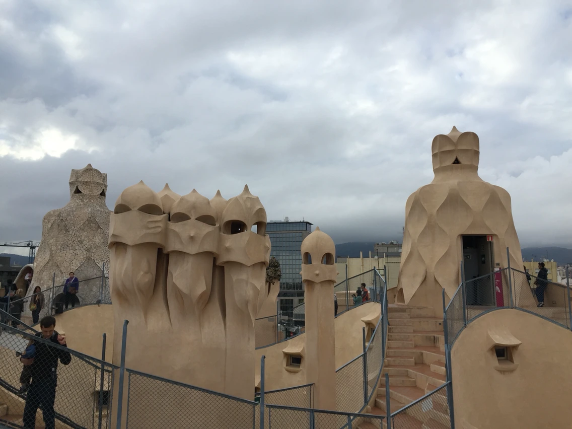 부러워 하고 있을 때가 아니다. 프로젝트1 실패로 그 대신 프로젝트2,3는 충분히 즐겨야 한다. 카사밀라에 들어가니 옥상 테라스 먼저 보란다. 엘리베이터 타고 올라간다. 옥상에 놀라운 세상이 펼쳐진다. 이건 도무지 옥상이 아니다. 외계의 조각물들이 있는 화성 같다고나 할까? 로보트 모양, 봉화대 모양 등 다양하게 우아한 곡선을 뽑내고 서 있다. 가우디는 진짜 천재다. 나무, 나뭇잎, 나무껍질, 도마뱀 등 다 자연에서 모티브을 얻어서 만든거란다.