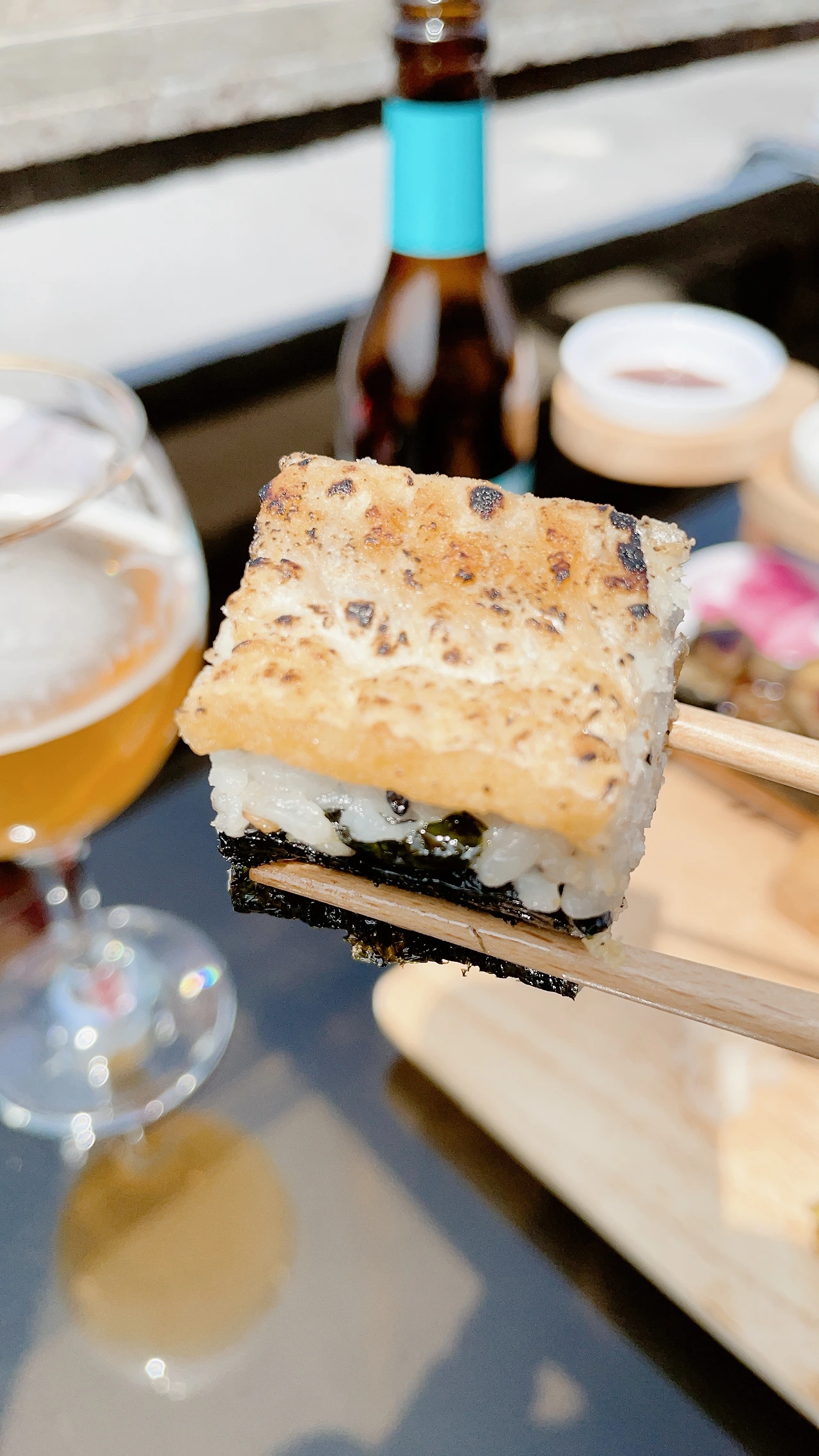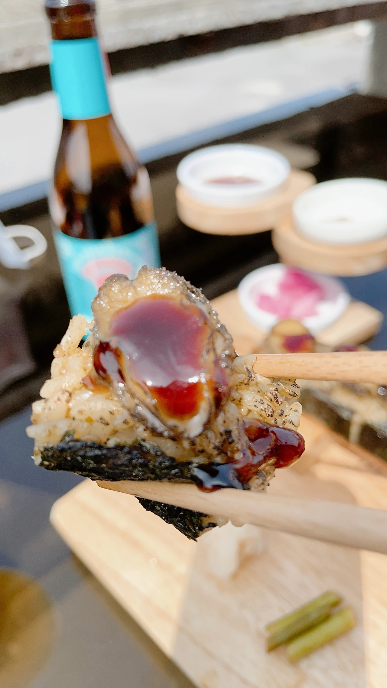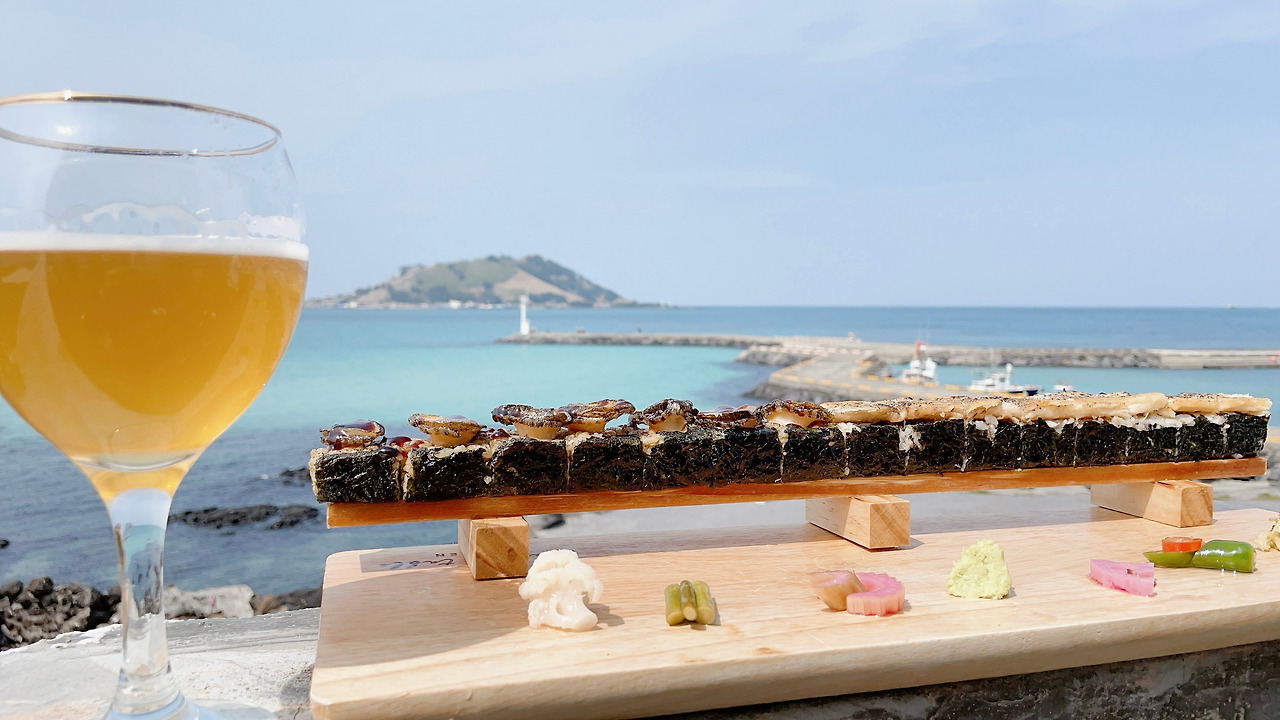 다시 걷다. 부둣가 옆 2층에 '털보 협재밀(meal)'이 보인다. 순살통갈치김밥이 유명한 곳. 위치도 파란 바다와 비양도가 눈앞에 똬악! 난 순살갈치김밥과 전복김밥 반반으로 시켰다. 제주 에일과 같이 먹으니 꿀맛.