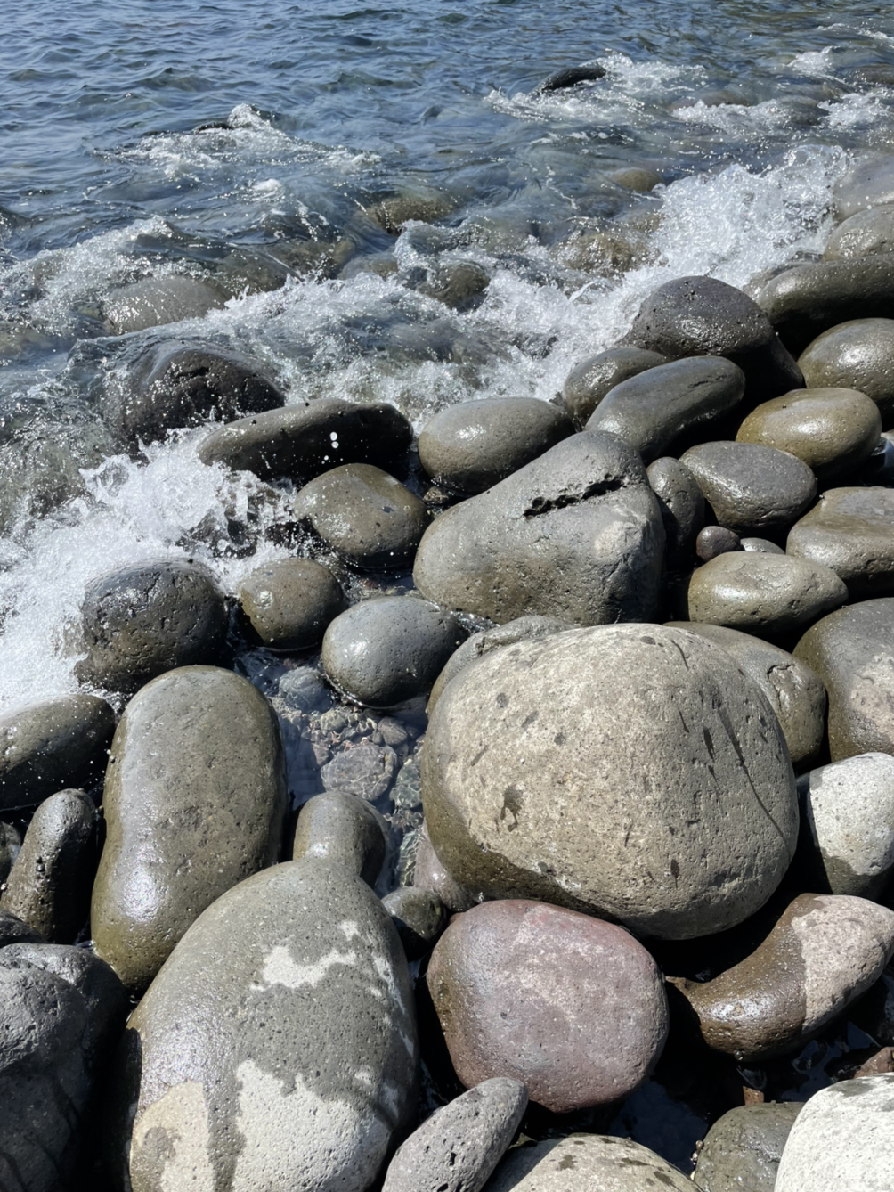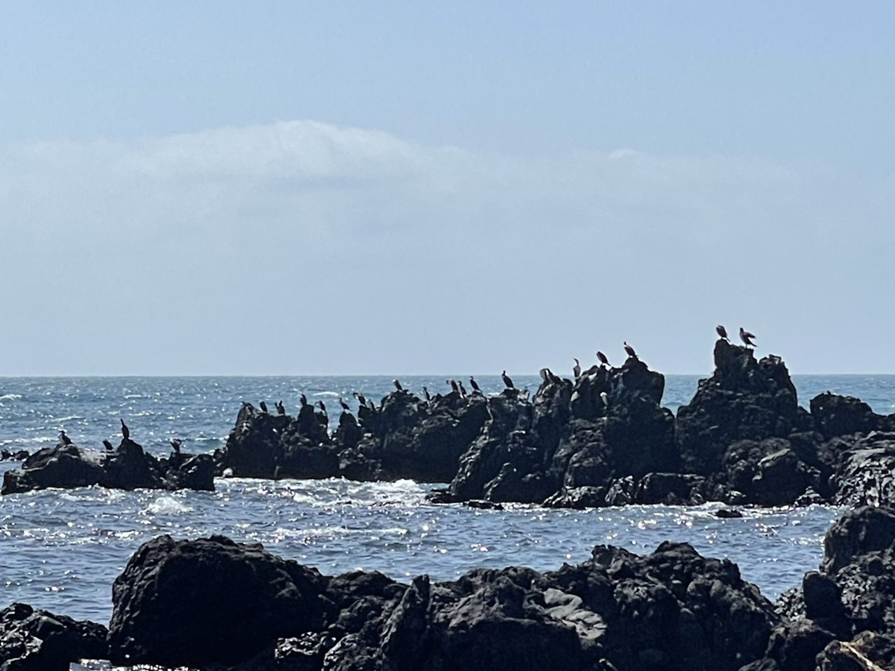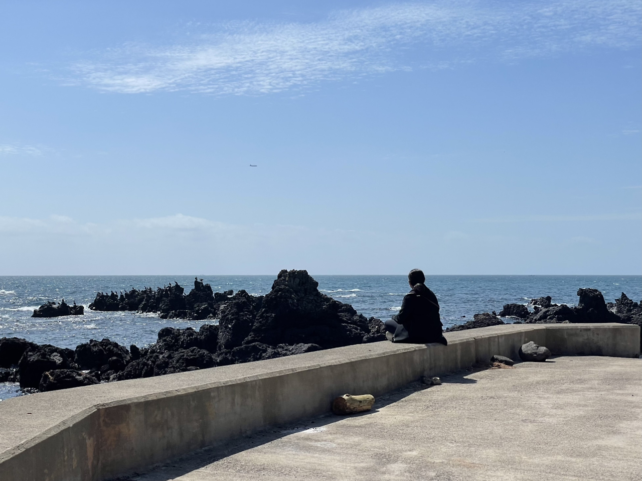 마을 골목길을 지나니 바닷가를 끼고 걷는 길이 나온다. 작은 돌들과 바위를 밟으며 걷는다. 맑은 하늘과 푸른 바다, 잔잔한 파도, 살랑이는 바람. 조금 더 걸으니 바위가 멋진 곳이 나온다. 검은 바위와 바라보며 난간에 걸터앉아 있는 한 여인, 무슨 생각을 하고 있나요? 꼭 바위 위에 있는 갈매기처럼. 그래도 갈매기는 나란히 앉아 있는데.