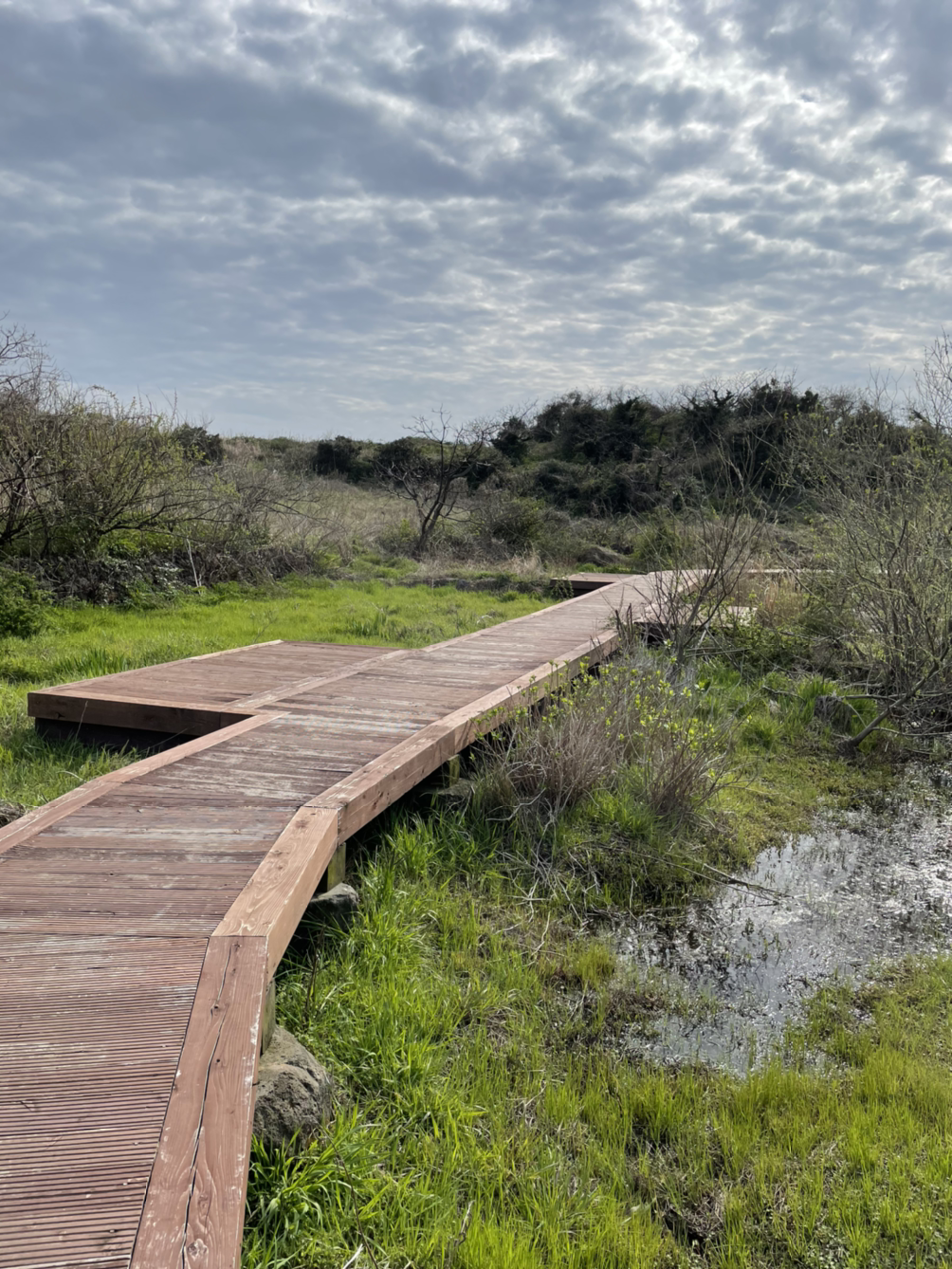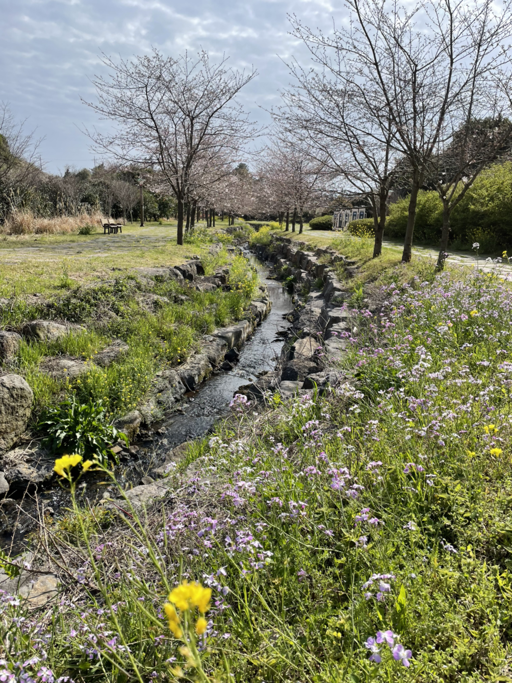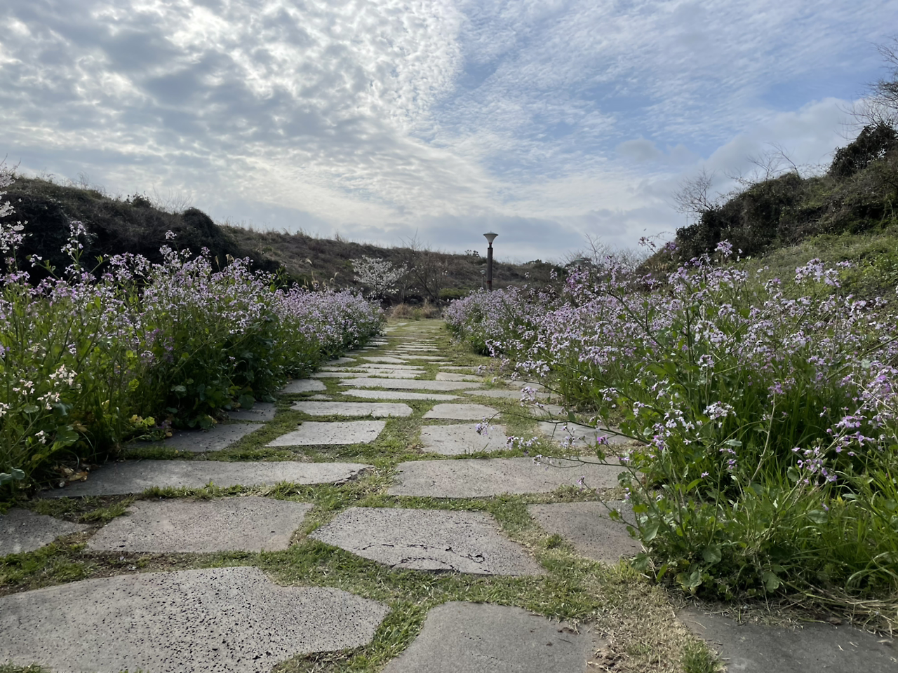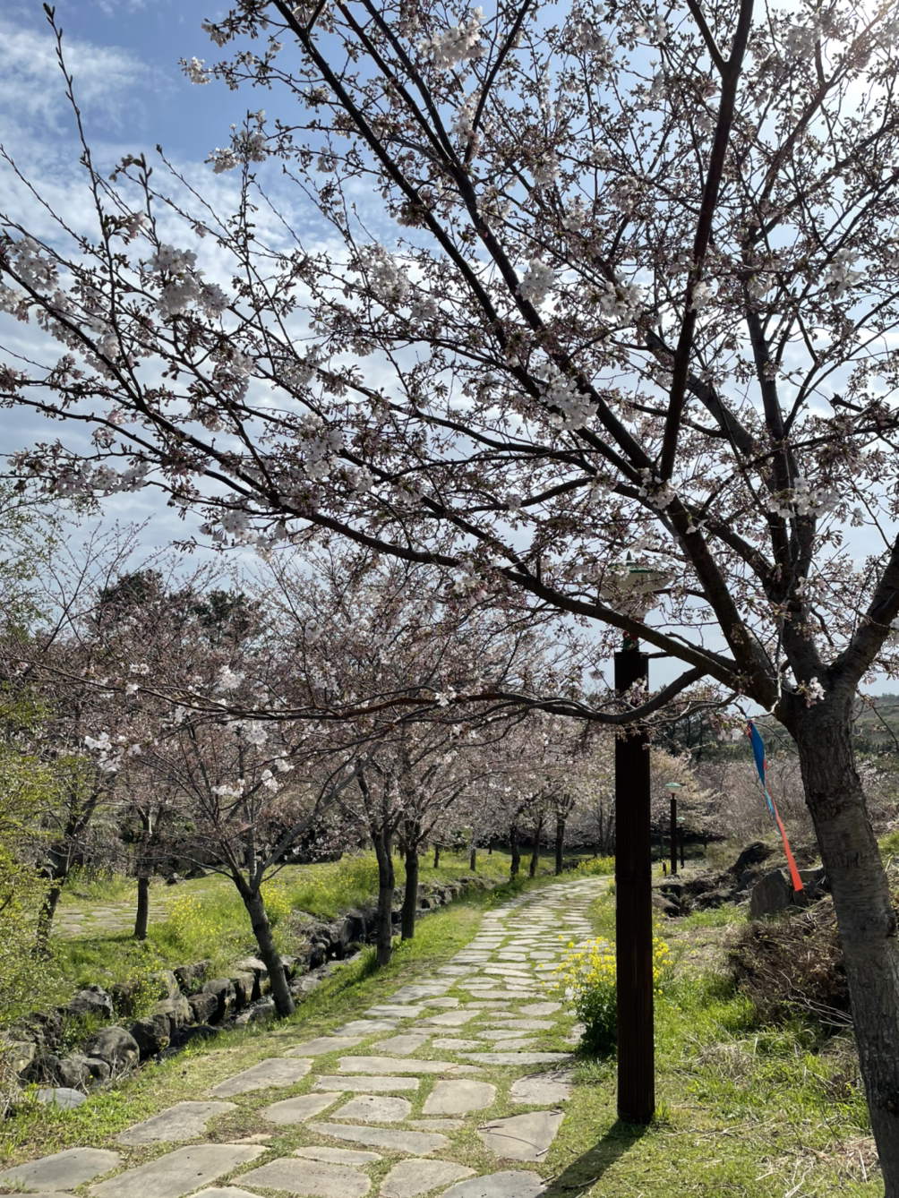 여래동부터는 계속 나지막한 내리막 길이다. 지루한 차도 옆 길을 걷다 여래생태공원으로 들어선다. 양 옆으로 벚꽃과 유채꽃이 잘 가꾸어진 산책로이다. 자그마한 개울과 습지대가 형성되어 있어 다양한 식물들도 볼 수 있다. 1주만 늦게 왔으면 벚꽃이 만개했을 듯한데 지금은 조금 이르다. 어떻게 제주시 보다 남쪽인 서귀포 인근에 벚꽃이 올핸 늦지?