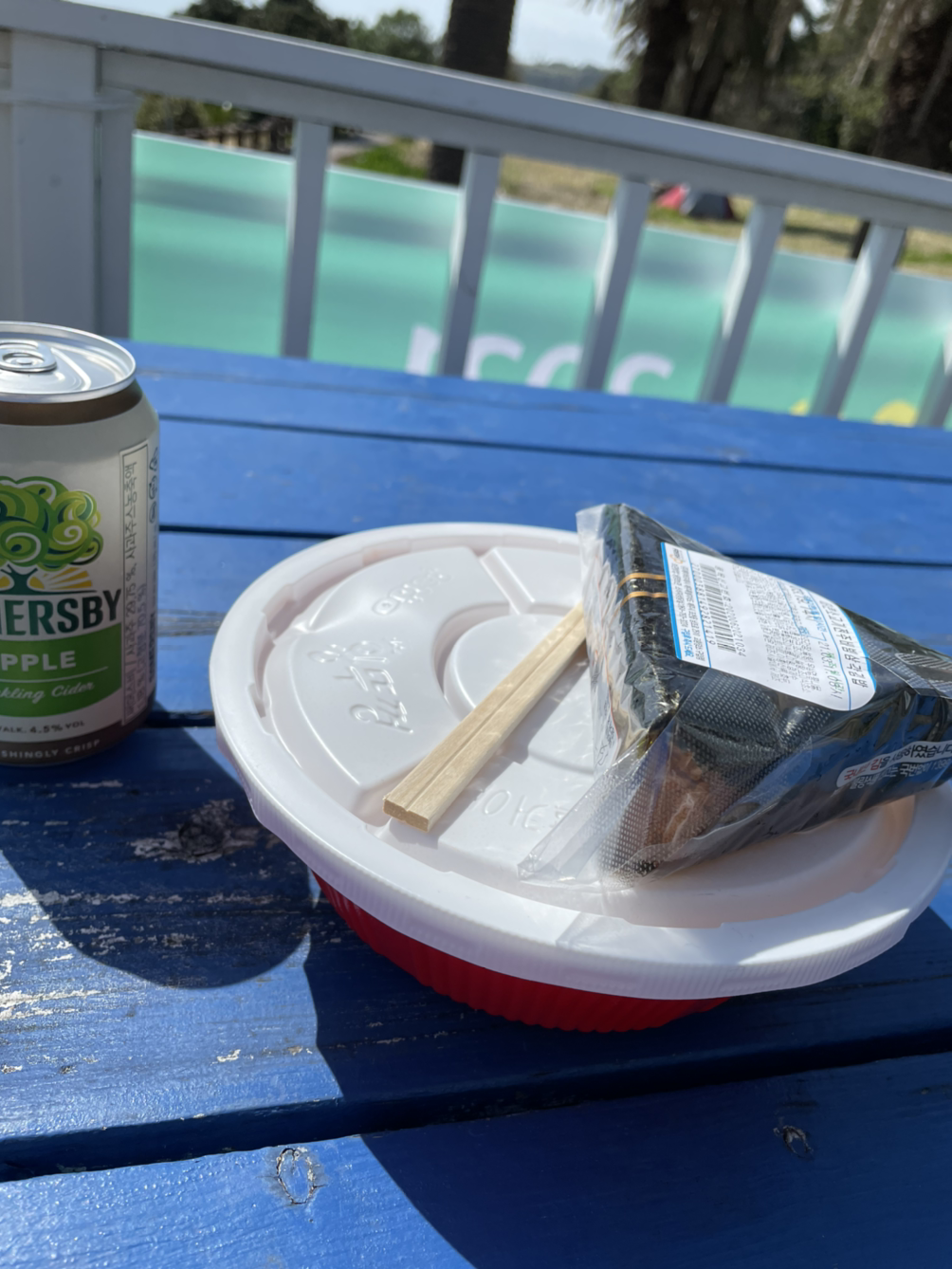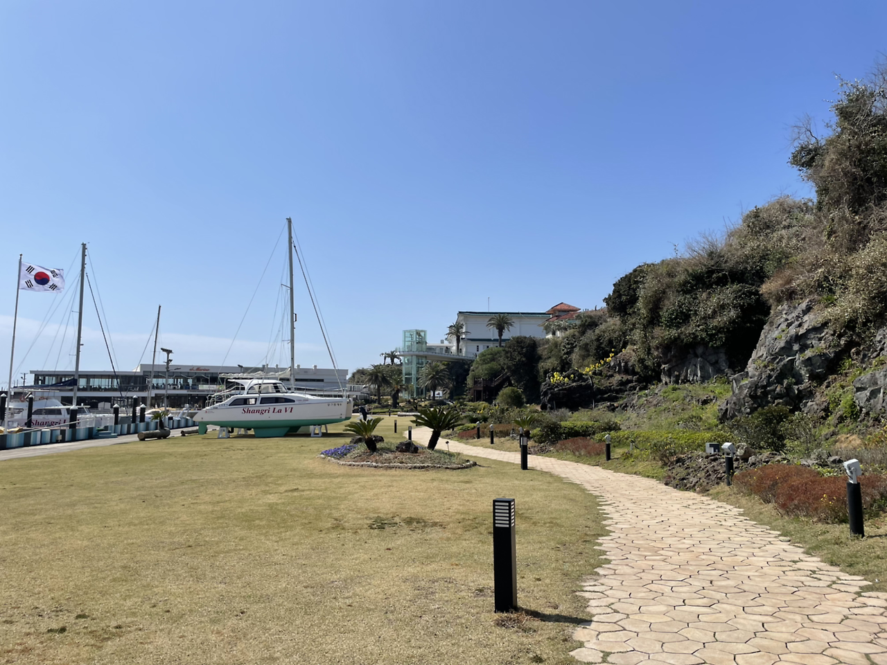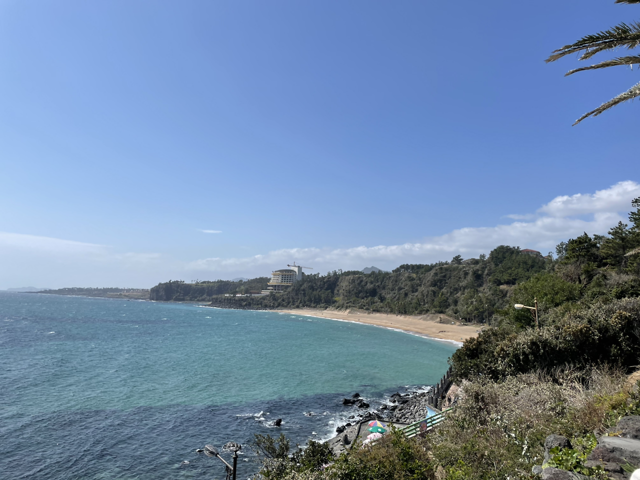 오름에서 다 내려오니 오른쪽으로 가는 화살표가 살짝 보인다. 돌다 이제 길을 제대로 찾은 거다. 그렇게 요트 선착장, 중문 색달해변이 보이는 럭셔리 분위기의 더클리프(The Cliff)를 지난다. 파라솔 아래 햇살을 만끽하며 비스듬히 기대거나 누워있는 연인들이 무척 부러웠다. 그 부러움은 사발면과 맥주로 달래야지. 1:50에 더클리프 옆 편의점에서 같은 전망을 몇천원의 가격으로 즐기며 점심을 해결하다.