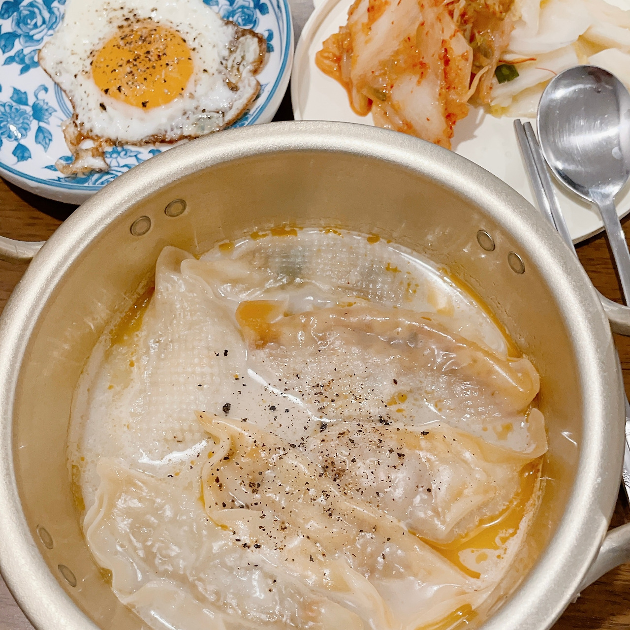 전화를 끊고 뜨끈한 게 먹고 싶어 곰탕국물에 만두를 넣어 만둣국으로 만들어서 먹었다. 든든하다.