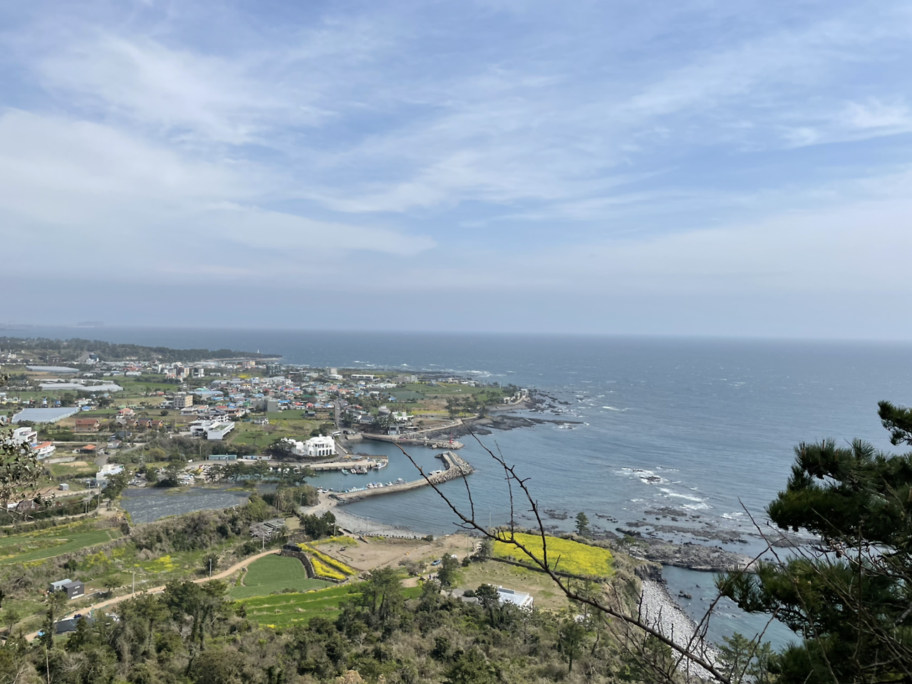계속 언덕이 이어진다. 언덕을 오르니 오른쪽으로 길 표시가 되어 있다. 그때 한 청년이 왼쪽에서 나오면서 이쪽 오솔길을 따라가다 보면 전망 좋은 곳이 나온단다. 그래서 올레길 코스에서 잠시 벗어나 그곳으로 향했다. 전망대에선 전날 걸은 중문, 대평항 등이 시원하게 보인다. 외진 좁은 길을 헤치며 잘 온 것 같다.
