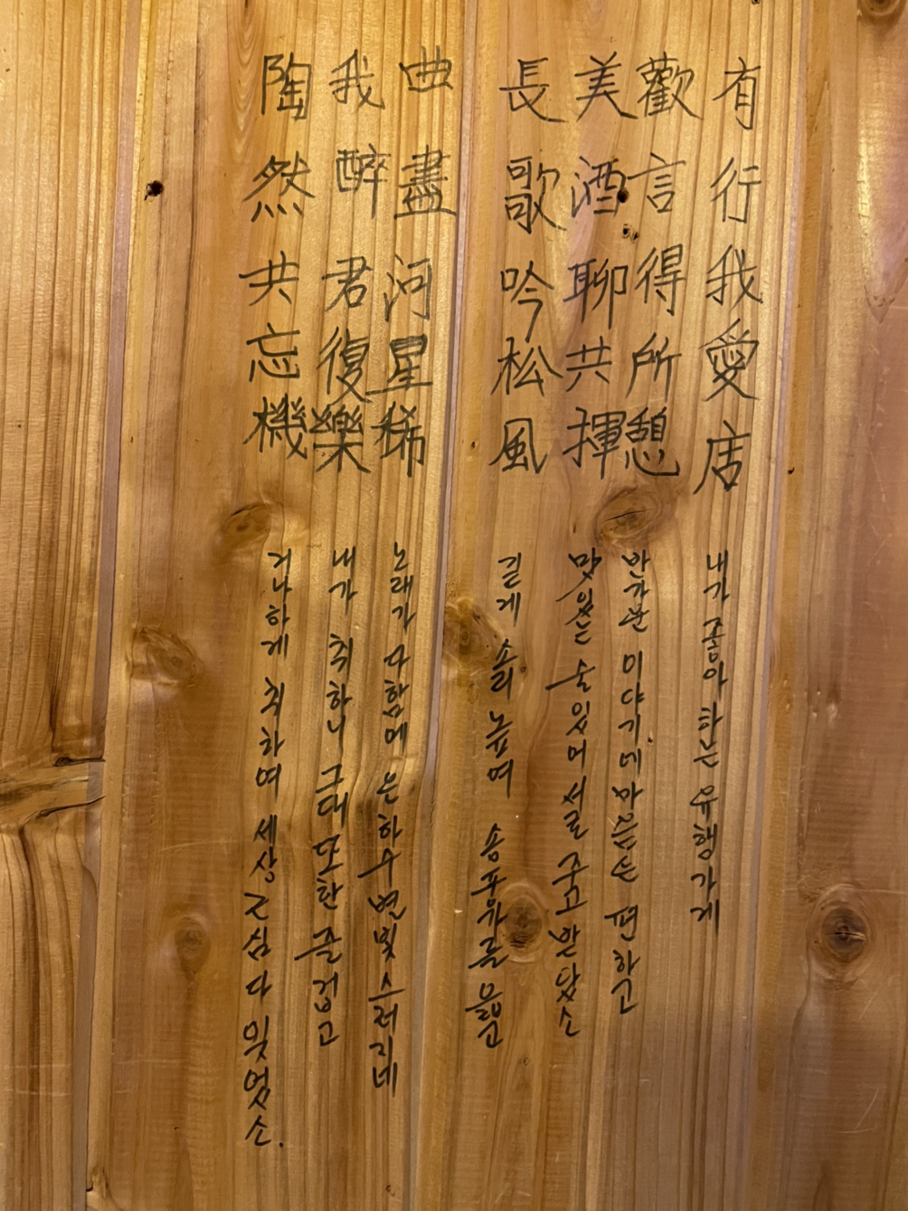 다시 운전해서 제주시로 온다. 숙소 근처 포차에서 제육볶음에 한라산 소주 한잔 한다. 숙소 근처에서 맘 편히 먹으니 좋다. 오늘 처음 들른 유행포차, 포차 안 벽에서 멋진 한시를 발견하다.