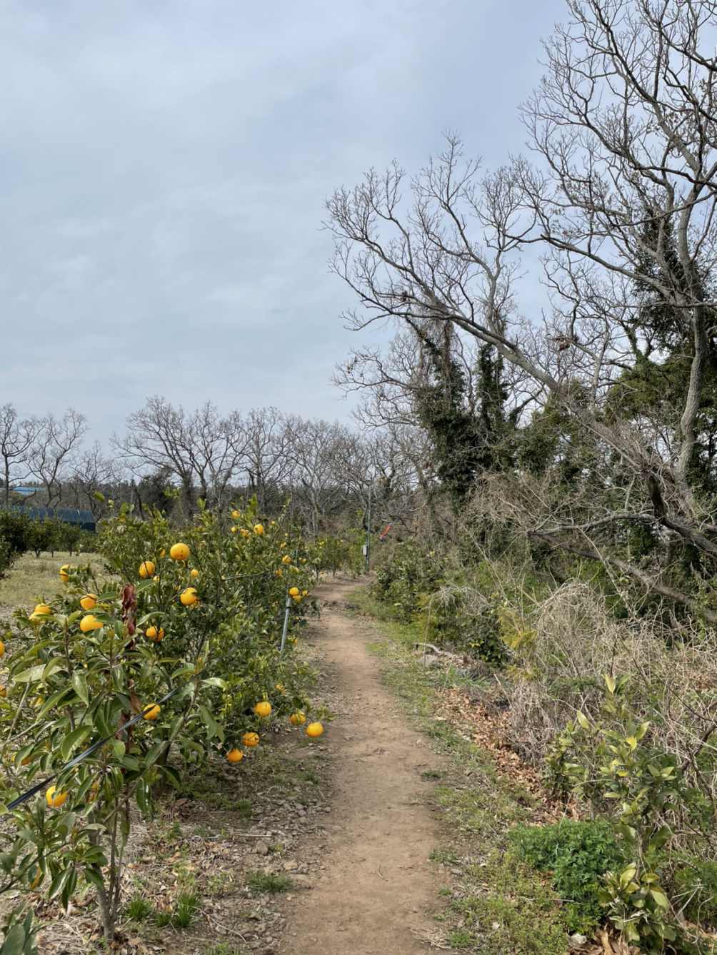 이제부턴 내리막 길이다. 귤나무 밭을 지난다. 그런데, 올레길 바로 옆 길가의 귤나무만 수확하지 않은 귤이 달려있다. 산티아고 순례길처럼 길가의 포도나무를 순례자들을 위해 수확하지 않은 것과 같은 이유일까? 따먹고 싶다. 그렇지만 참는다.