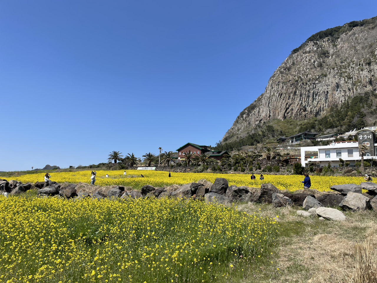 삼방산을 끼고 걷는 길, 유채꽃의 향연과 파란 바다. 저 멀리 한라산도 보인다. 해변을 끼고 계속 걷는 길, 파란 바다와 구름, 검은 바위가 조화를 이룬다. 산방산은 좌우가 균형을 이루지 않는데 그 묘한 아름다운 균형비가 있다. 그건 주상절리와 같은 바위와 그 사이에 있는 푸름의 조화랄까. 거기에 파란 하늘까지 배경을 삼아 주니 아름다움이 배가 되는 듯하다. 주상절리 아래 솟아나는 파랏 가지와 유채꽃은 그 풍경을 살짝 거들뿐.