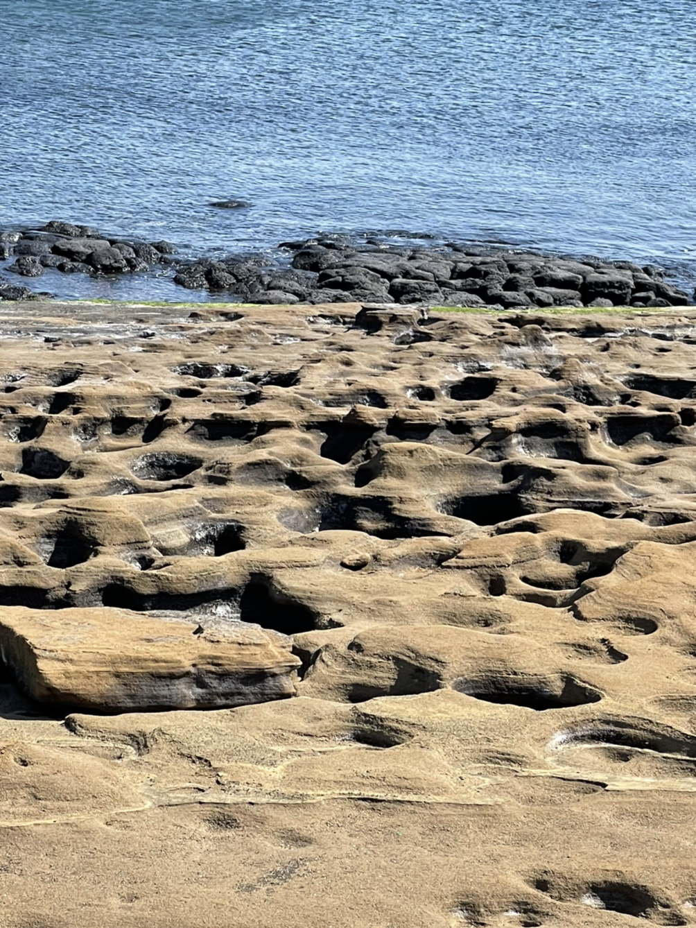 하멜에 잠시 빠졌다 벗어난다. 이제 사계리 화석 해변을 지난다. 지금은 출입금지 지형인데 바위에 각종 원시 동물들의 발자국이 있다. 그것도 파도치는 검은 현무암 위. 그 해변도 참으로 아름답다. 저 멀리에서 형제섬이 보인다.