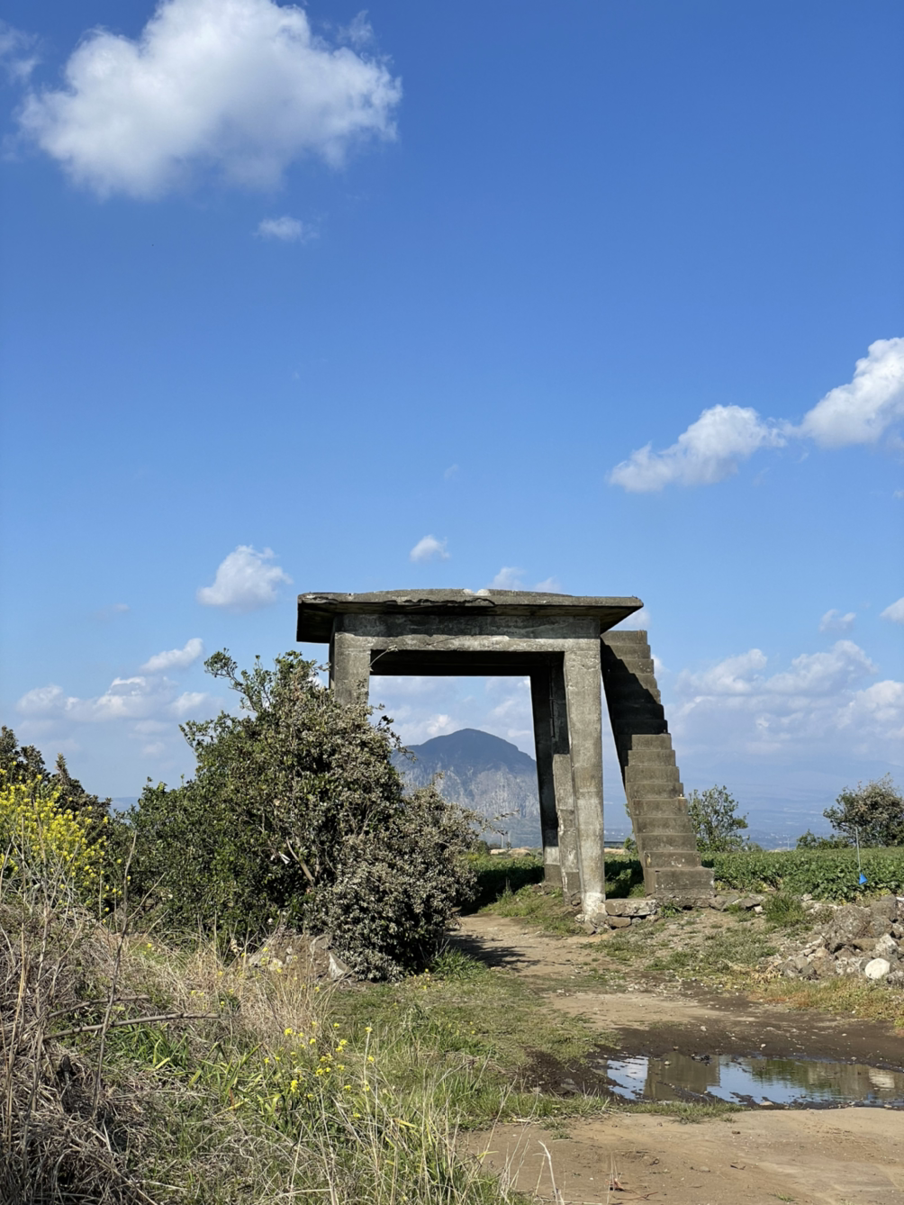 일제가 전쟁 목적으로 구축한 제주도에 있는 제주 비행장(현재 제주공항)에 이어 서귀포 인근의 아뜨르 비행장터와 아직도 남아 있는 콘크리트 관제탑. 그 관제탑을 통해 저 멀리 보이는 삼방산이 묘한 조화를 이룬다. 바람 또 바람. 아, 숲은 또 언제 나오는 건가. 마치 산티아고 순례길 중 끊임없이 펼쳐진 흙먼지 날리는 메세타 고원을 걷다 숲을 기대하는 것처럼.