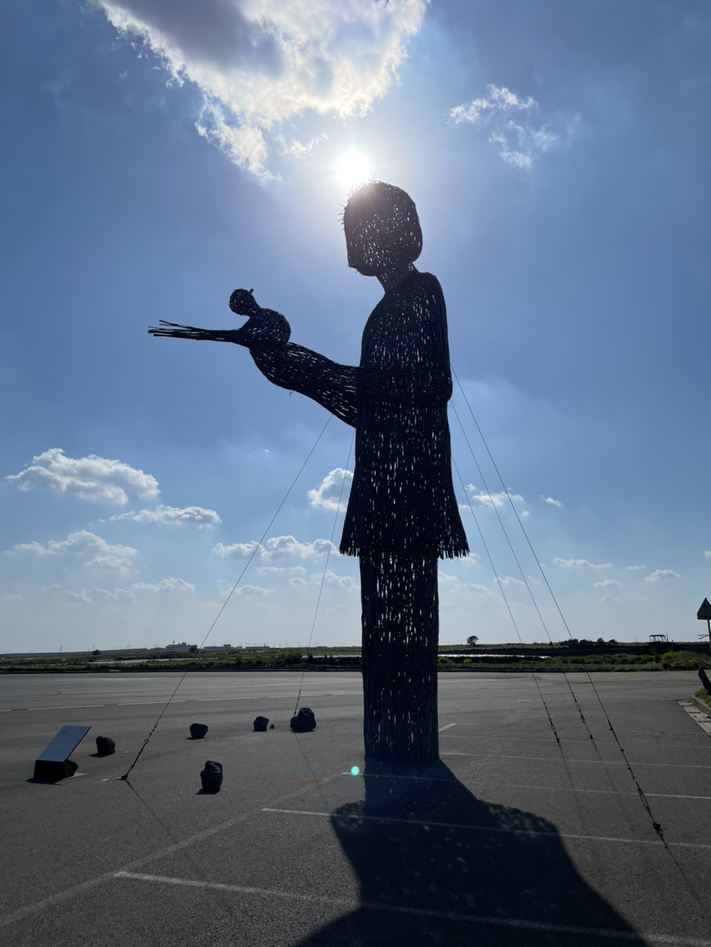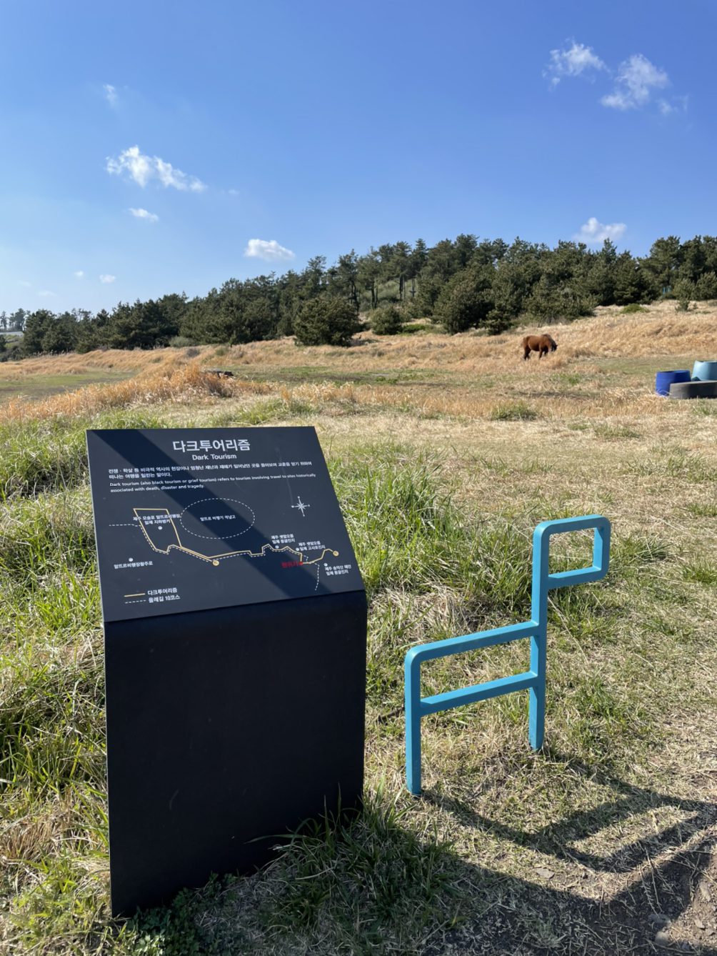 또 이어진 벌판 길. 다크 투어리즘이라 부르는 곳이다. 4.3의 아픈 역사와 일제 잔재가 남아 있는 곳. 아픈 역사도 역사다. 그것을 기억하고 되새기는 것도 후손들의 몫이다. 그런 의미에서 올레길에 다크 투어리즘 코스가 들어 있는 것은 탁월한 선택 같다. 그 언덕으로 들어선다. 일제가 구축해둔 해안포 사격 진지가 보인다. 더 내려가니 4.3 희생자 추모비도 있고. 그리고 그 앞에 거대한 조형물, 파랑새가 있다. 다크 투어리즘에서 희망을 보게 해준다.