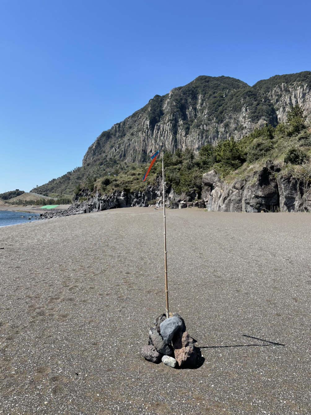 12:12에 10코스를 걷기 시작하다. 첫 언덕의 헐떡거림, 그리고 이어지는 산방산이 앞에 보이는 검은 백사장. 거기서 잠시 리본을 놓치다. 백사장으로 이어진 올레길, 리본도 안 보인다. 한 아저씨가 알려줘 백사장 끝에 놓인 대나무 막대에 꽃인 리본을 발견하다. 딱 산티아고 메세타 고원 흙먼지 길을 가다 시야 거의 끝 지점에서 한 줄기 생명수같은 리본을 발견한 느낌과 같았다.