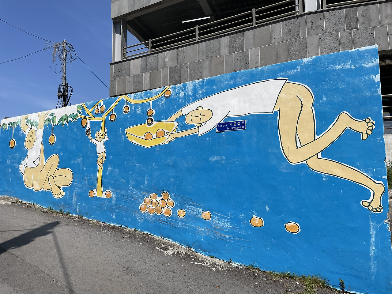 서귀포 시내에서 리본을 계속 놓쳤다. 그래서 아예 네이버 지도를 켜고 걷는다. 하늘은 맑고 햇살은 뜨겁다. 이중섭 거리를 지난다. 그의 앙증스러운 그림이 난 좋다. 이중섭 그림을 벽화로 옮겨 놓은 것에 빠져 또 길을 잃다.