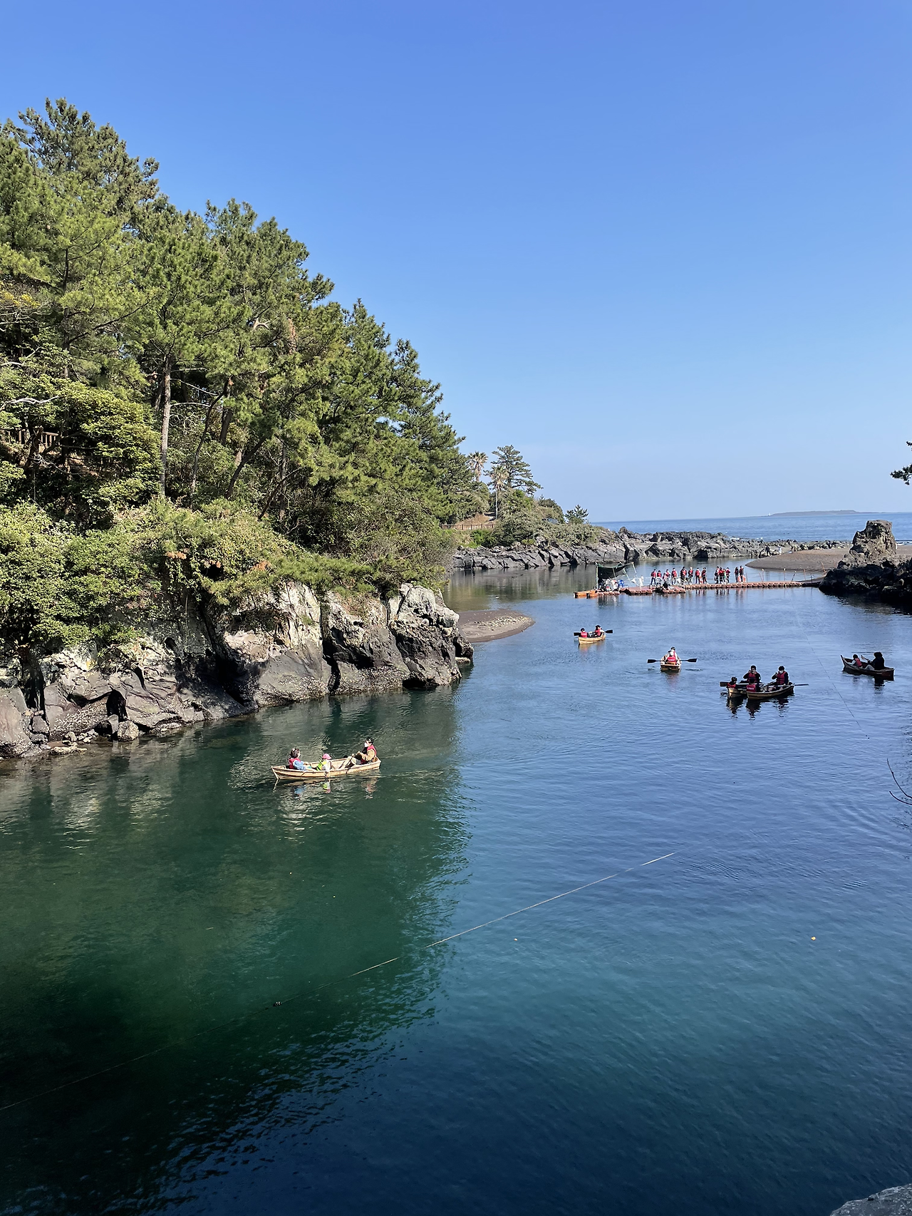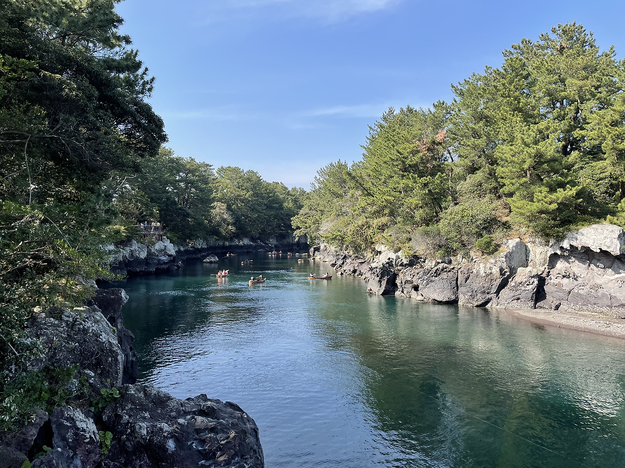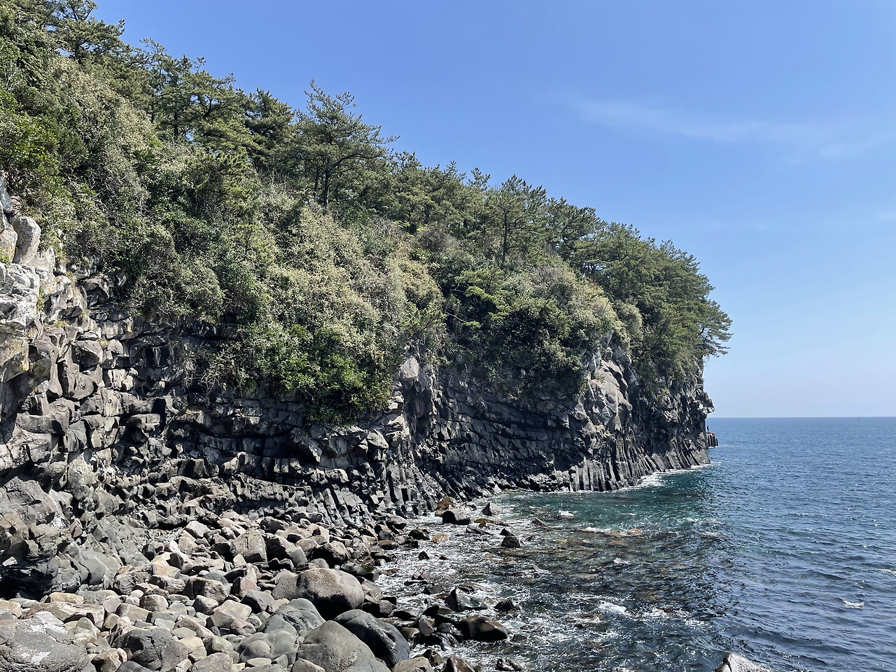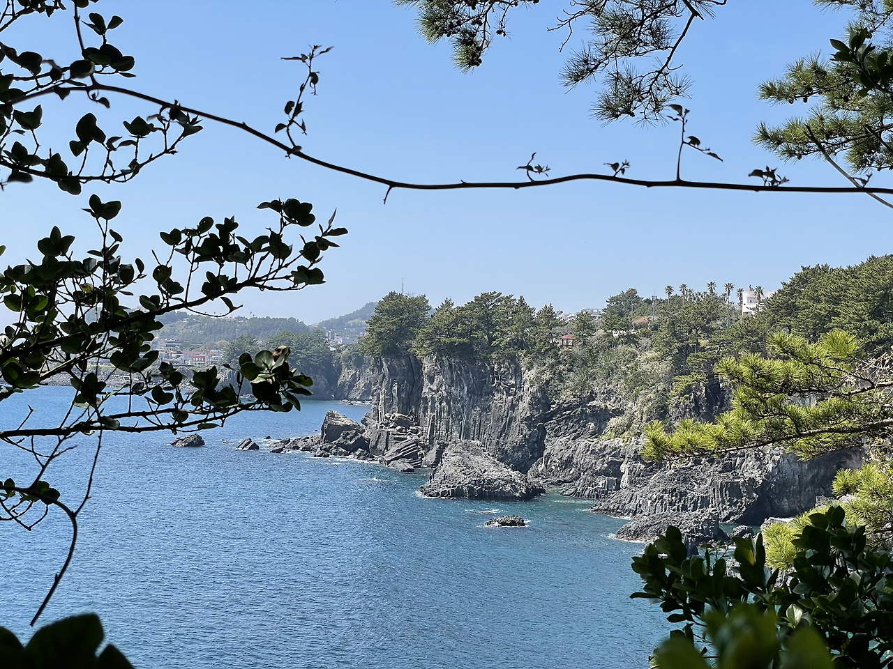 특히 쇠소깍은 한라산 백록담 남벽과 서벽에서 생겨나 해안으로 이어지는 하천인 효돈천이 바다와 만나면서 생긴 곳이다. 깊은 수심, 기암괴석, 울창한 소나무 숲이 절경을 이룬다고 설명되어 있는데, 오늘 같이 맑은 날에 그 짙은 옥색 물빛과 깎아지는 절벽, 그리고 푸르디푸른 숲의 조화가 천하일색이로세. 한가히 배 띄워 노니는 모습을 보니 한 폭의 동양화로세.