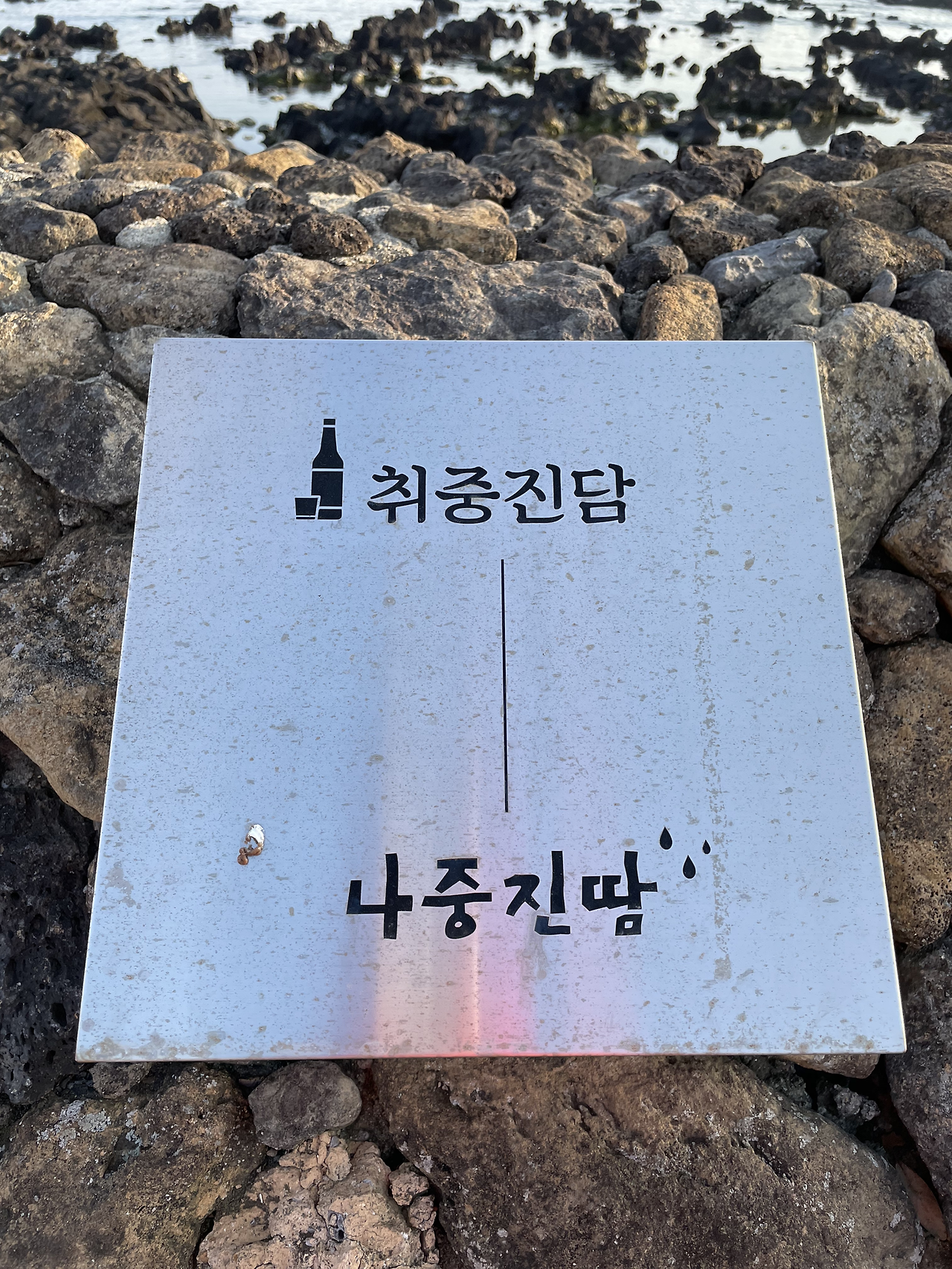 쇠소깍 다리 바로 옆 6코스 시작점에서 스탬프를 찍고 계속 걷는다. 위미항이 보이는 어느 한적한 해안가에 중년의 남녀가 꼭 껴안고 있다. 지나치기 뭐해 멀찍이 떨어져 물 한잔 마신다. 근데 자리를 뜨며 아이스커피 플라스틱 컵을 잘 안 보이는 곳에 곱게 버려두고 간다. 흑. 내가 주워 배낭에 넣고 걷는다. 가다 그 커플을 지나쳤는데 뭐라 한마디 하려다 참는다. ㅎㅎ
