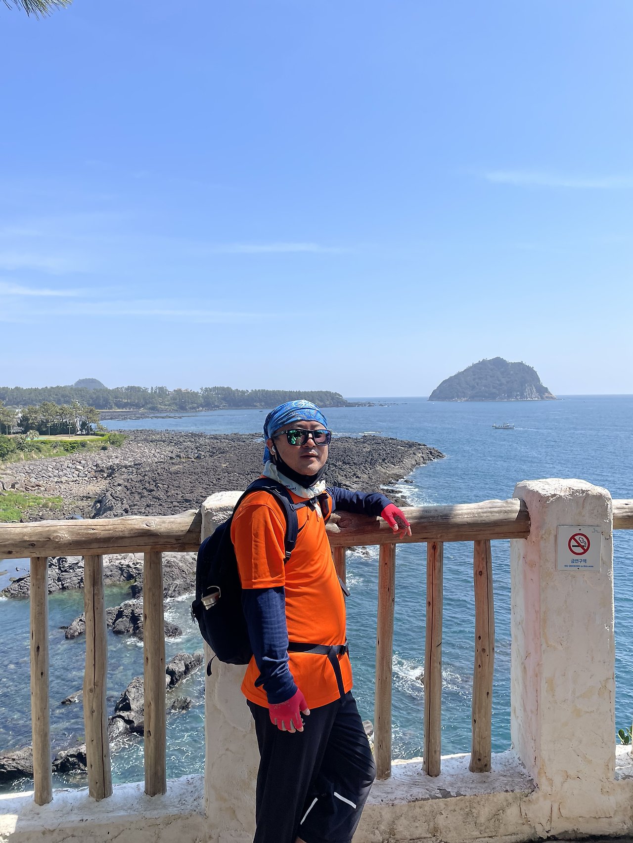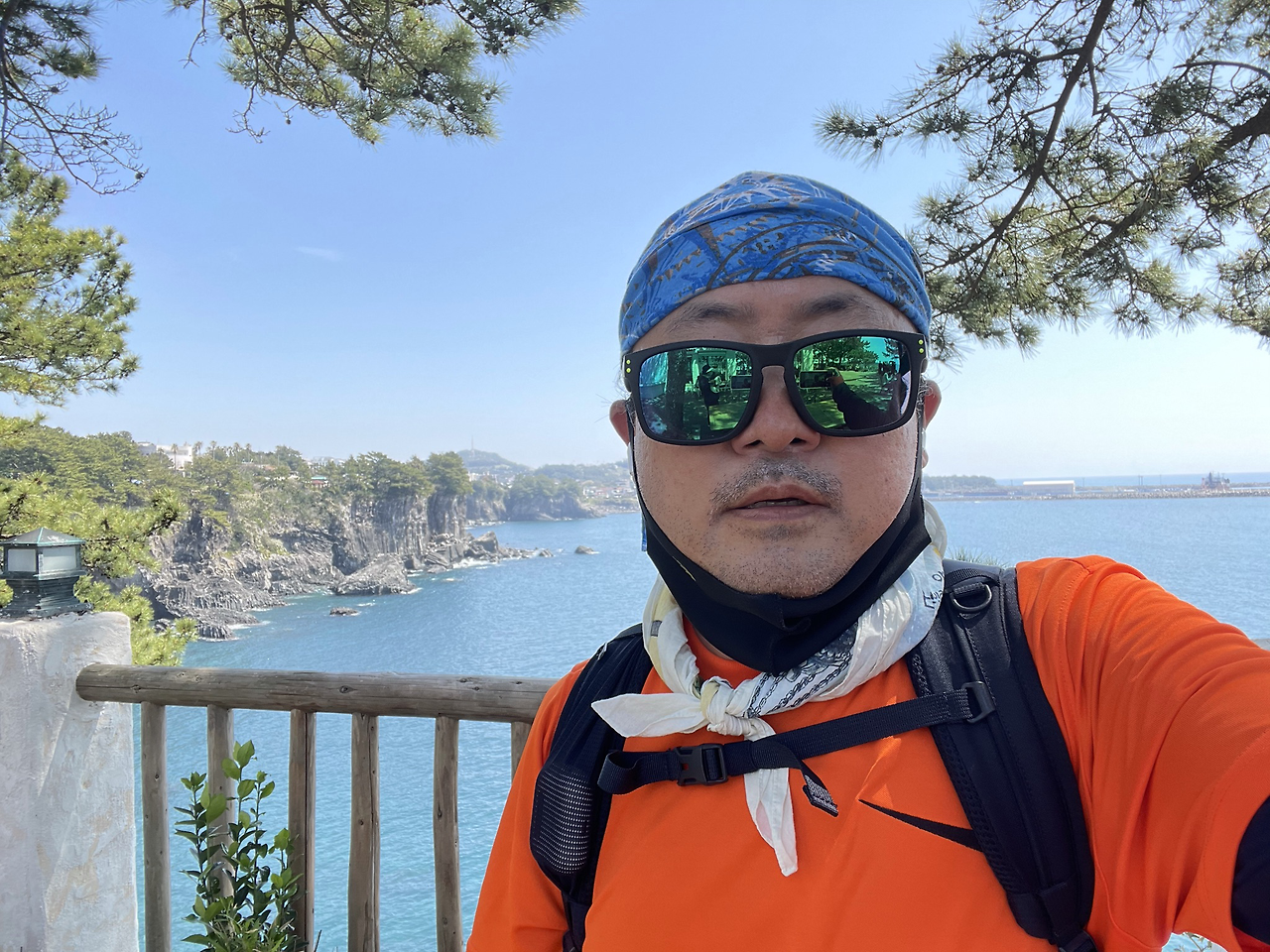 깎아지는 절벽 위로 기가 막힌 올레길을 만들어 놨다. 주상절리, 폭포, 저 멀리 보이는 섬, 그리고 전망 좋은 곳에 있는 카페. 눈이 호강한다. 더베이리조트의 멋진 카페 앞에 있는 전망대에서 사진을 하나 부탁해서 찍었다. 이번에도 여인에게 부탁해서 찍었다. 오렌지색 상의와 검은 배낭의 색 대비가 맑은 날씨와 더불어 더 두드러진다.