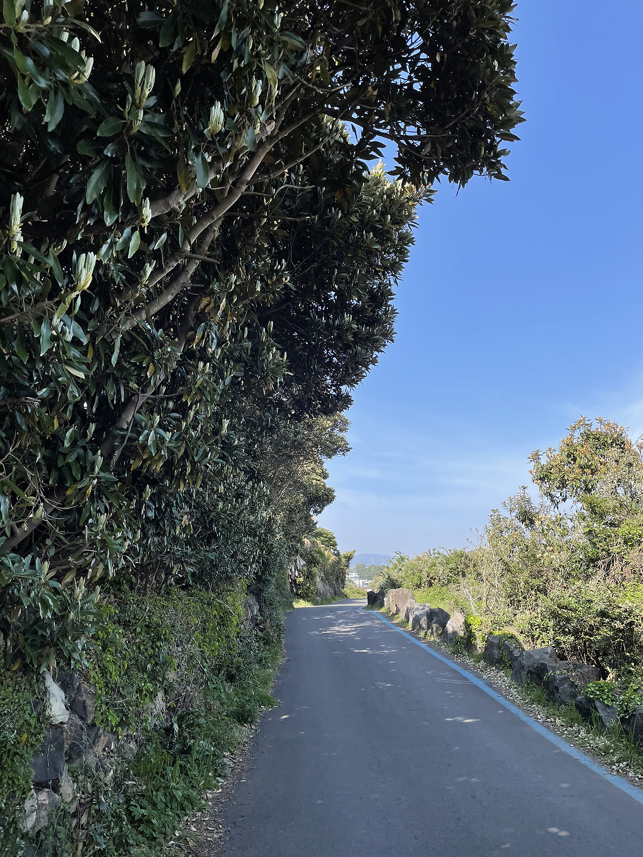 2:15에 다시 일어선다. 숨 헐떡 거리며 오르내리락 한 제지기 오름을 끼고 쇠소깍으로 가는 해안도로 길이 참 이쁘다. 야자수 같은 나무, 동백나무와 돌담 이건 색다른 풍경이다.
