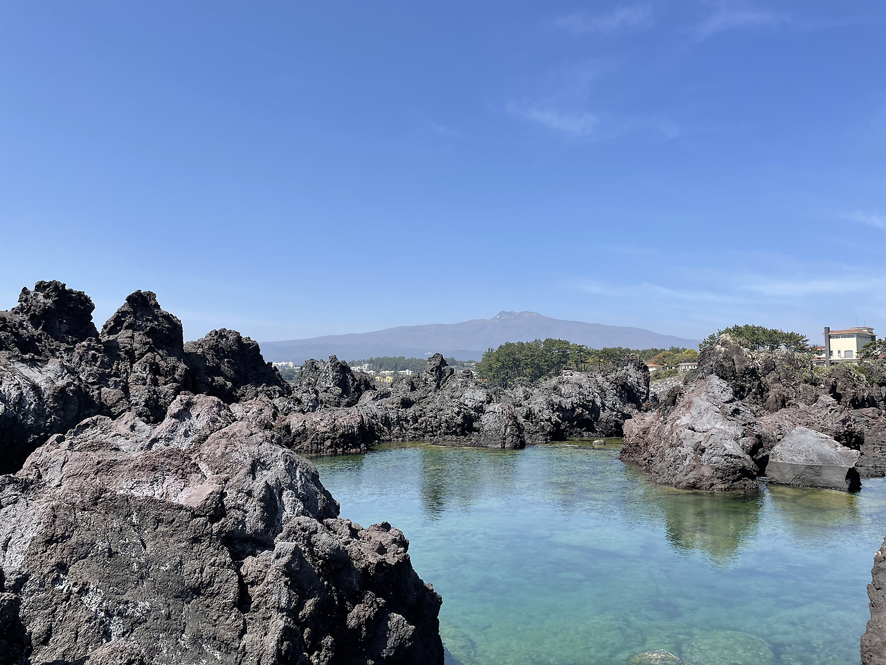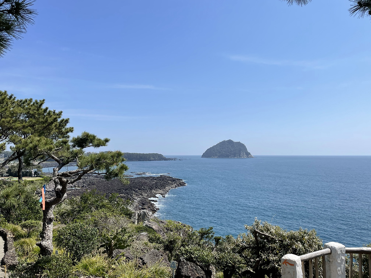 저 멀리 섶섬이 보인다. 숲길로 들어가는가 싶더니 소천지라는 곳이 나온다. 여기서 맑은 날 햇빛 방향에 잘 맞추어 한라산 방향으로 찍으면 한라산 그림자가 비치어져 장관이라고 한다. 나도 시도해 봤는데 그림자가 전혀 지지 않았다. 그래도 저 멀리 한라산이 보인다는 게 얼마나 좋으냐.