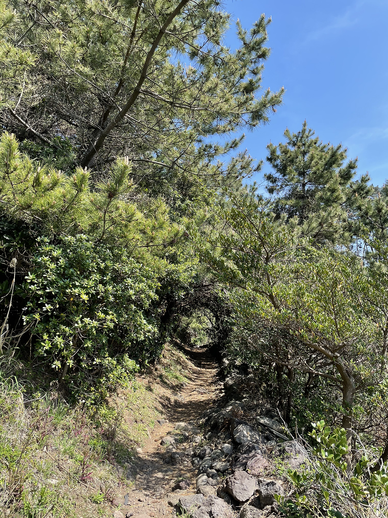 서복전시관을 끼고 정방폭포 방향으로 걷는다. 우측으로 바다가 보이고 햇살은 뒤에서 비춘다. 역방향으로 걸으니 해 등져서 좋네. 역방향은 오렌지색 화살표다(정방향은 파란색 화살표). 그래서 오늘 상의도 오렌지색으로 깔맞춤 했다. ㅎㅎ