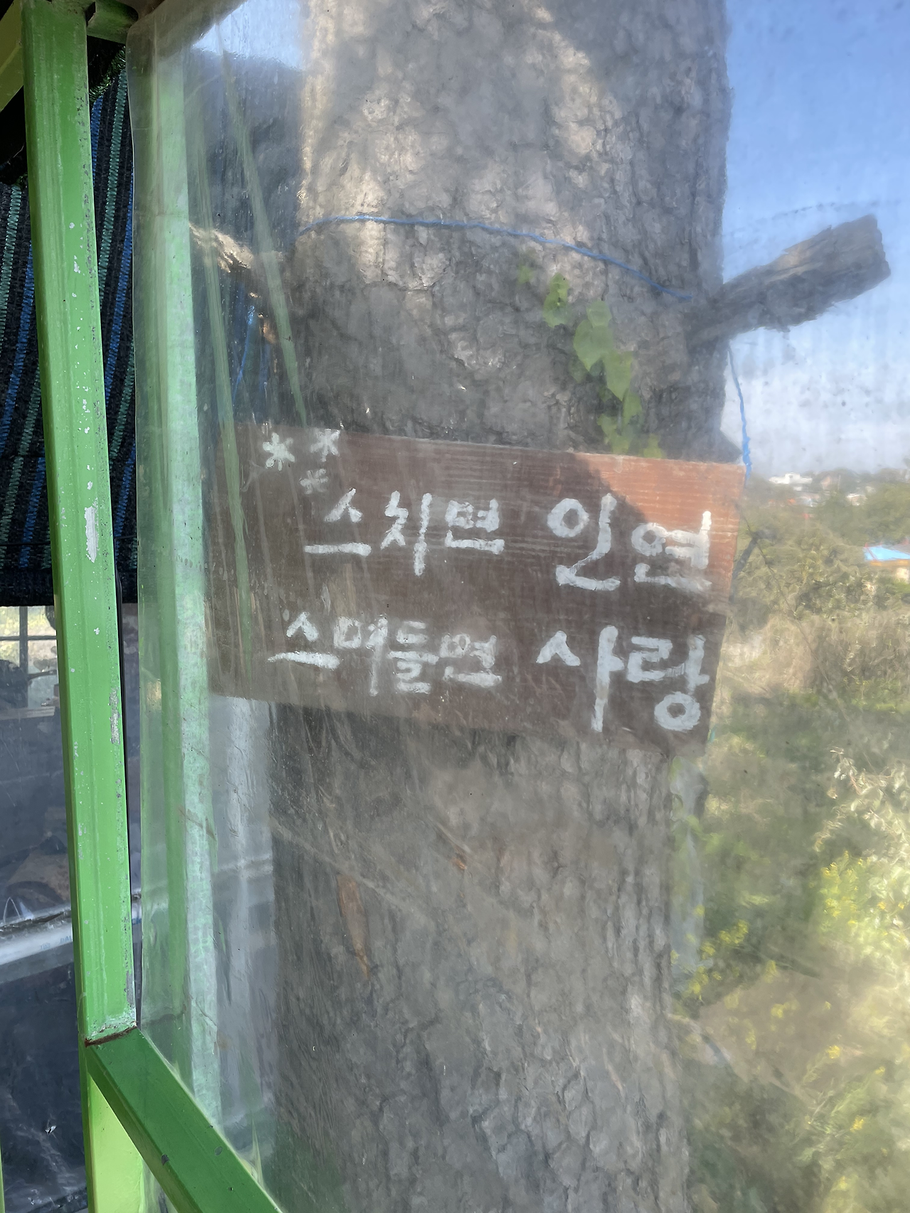 쉰다리 먹으며 앉아서 보니 저쪽에 ‘스치면 인연 스며들면 사랑’이란 문구가 보인다. 역시 멈추고 쉬면 안보이던 게 보인다. 그리고, 말 그대로 스치기만 해도 인연인데, 스며들면 사랑으로 커진다. 그래, 나도 올레길 걷고 스치면서 많은 인연을 만들 수 있겠지. 사랑까지 하는 건, 음. 그건 안돼! 쫓겨나. 애정(愛情) 중에서 애(愛)는 안되더라도 정(情)은 되겠지. ㅎㅎ