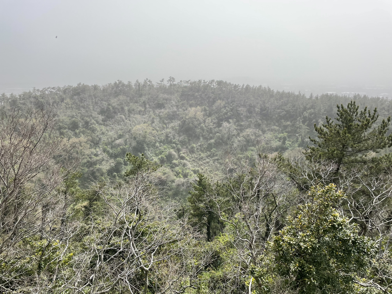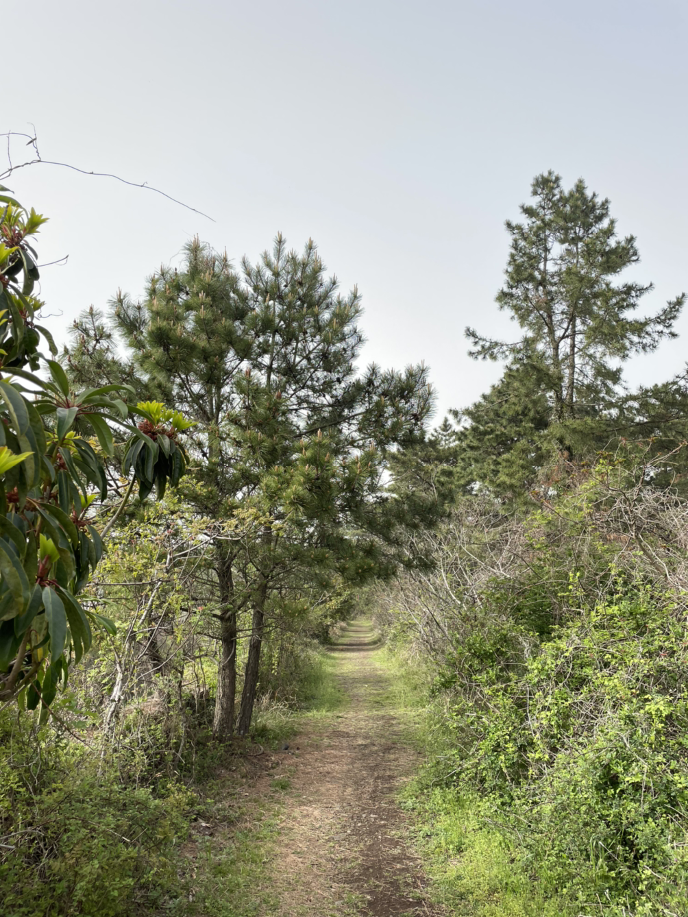 올라오니 바람도 살랑대고 숲 냄새 가득해서 좋다. 오름 둘레길 가벼운 발걸음으로 돈다. 그렇게 돌아서 오른 정상 전망대, 온 사방이 뿌옇다. 이 극심한 미세먼지로 하나도 안 보인다. 오늘 같이 미세먼지 극심한 날은 마스크 쓰고 걷는 게 더 힘들다.