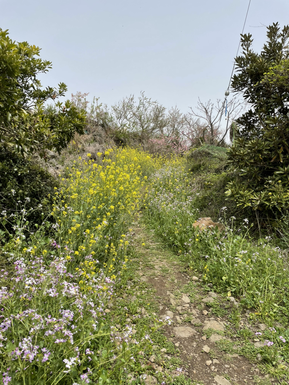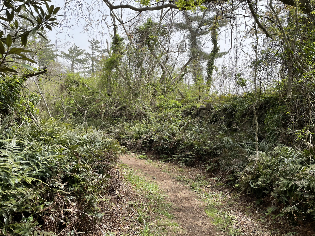 미나리 밭을 지난다. 참, 영화 미나리도 봐야 하는데. 계속 이어지는 돌담길, 참 이쁘다. 소나무도 새순이 올라온다. 보리밭에 외롭게 핀 꽃 한 송이도 보인다. 그렇게 걷다 고사리 숲길로 들어선다. 무성한 고사리와 나무를 휘감고 푸르게 덮은 담쟁이 잎이 조화롭다.