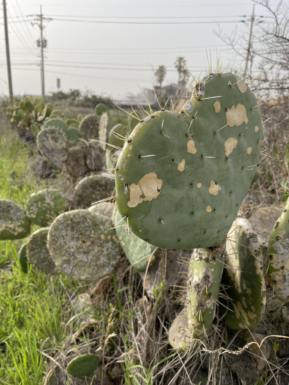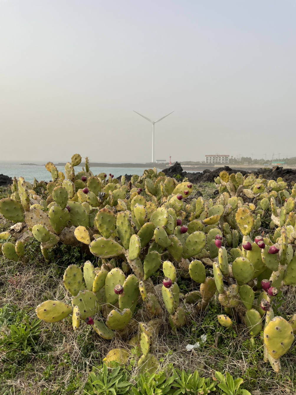 드디어 바다 바로 옆 바위에 자생한 선인장들을 보다. 딱딱한 바위틈에 뿌리를 박고 자생해온 끈질긴 생명력과 그것이 군락을 위룬 모습에서 아름다움을 느끼다. 선인장 외에 다양한 식물들이 바위와 더불어 살아가고 있다. 그런 선인장과 다양한 식물들을 보면서 거닐 수 있는 멋진 산책로가 있다는 사실에, 그 산책로가 올레길이라는 사실에 감사한다. 산책로 저 멀리 외롭게 돌아가는 바람개비도 운치 있다.