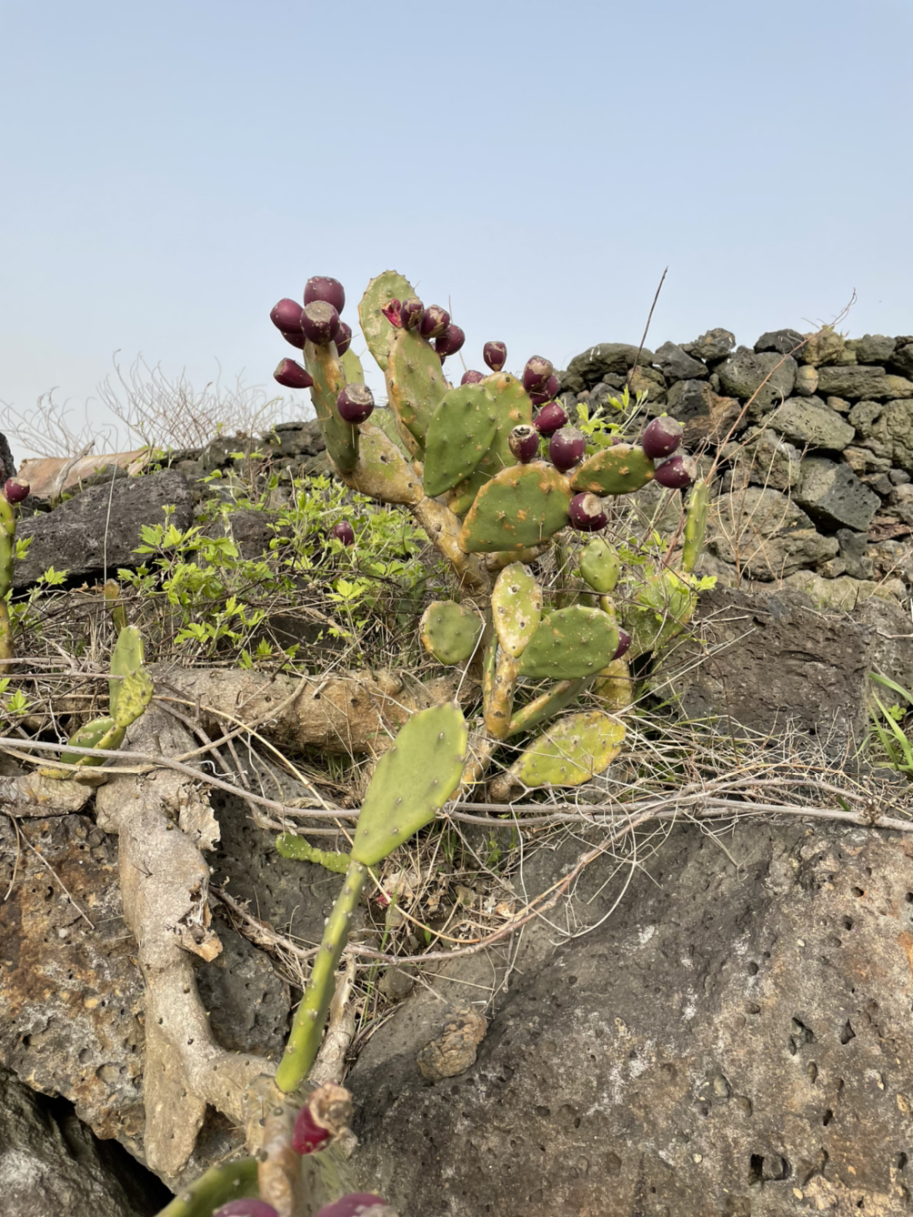 월령 마을로 들어선다. 돌담에 다 선인장이다. 월령 선인장 군락지는 국내 유일의 야생 군락지라고 한다. 제주도 서쪽에 있는 월령에 어떻게 선인장이 들어왔는지에 대한 여러 가지 설이 있는데 선인장 씨앗이 선인장 원산지인 멕시코에서 해류(쿠로시오 난류)를 타고 이곳에 밀려와 모래땅이나 바위틈에 기착한 것으로 보는 설이 유력하다. 멕시코에서 지구를 거의 반 바퀴 돌아서 죽지 않고 제주 월령까지 오다니.