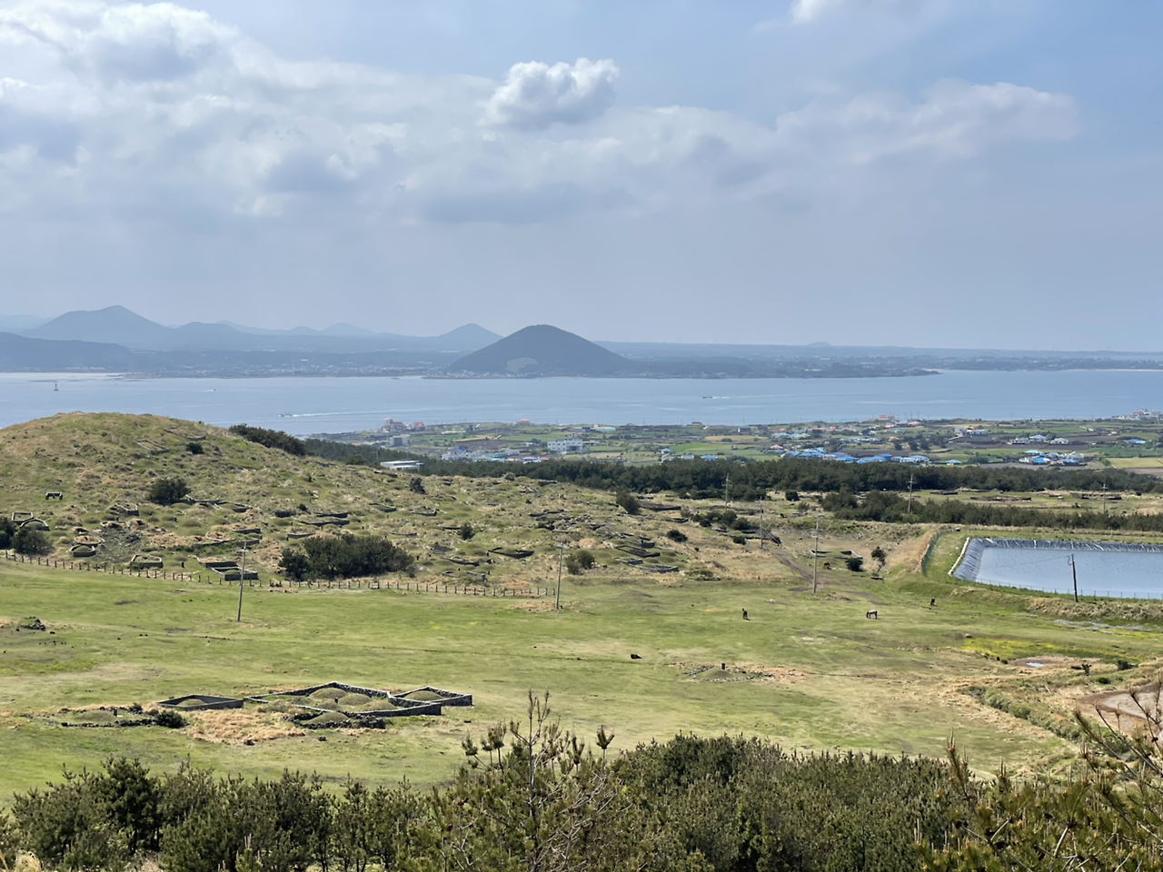 우도봉 입구에서 화장실에 들렀다 잠시 쉬며 연양갱 하나 먹다. 양주 한 모금도 빼놓을 수 없지. 다시 오른다. 배도 고프고 살짝 힘이 부치려는 순간 봉우리에 다다르고 그 이후부턴 능선을 탄다. 아래 우도의 전경이 시원하게 펼쳐진다. 반대편은 일출봉이 그 자태를 드러낸다. 분화구에 있는 드넓은 푸른 초원에는 말들도 뛰놀고 있다.