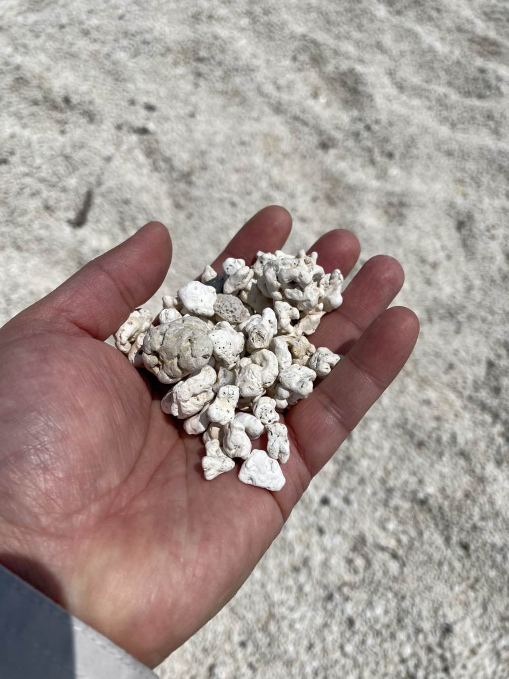 산호가 부서져 만들어진 산호해변(홍조단괴해빈)은 사각사각 밟는 재미도 있고 모래밭 흰색의 고운 빛깔도 이쁘다. 꼭 밟아보고 만져봐야 그 느낌을 잘 알 수 있다. 저 잔 산호 덩어리들도 파도와 바람에 쓸리고 부딪치면 잘게 부수어지겠지.