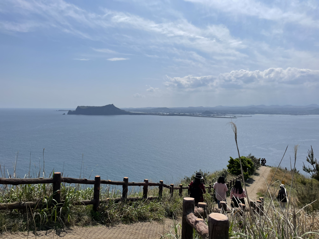올레코스는 등대에서 바로 내려오는 코스다. 내가 언제 우도에 올지 모르니 남은 산책로를 다 돌기로 했다. 그래서 다시 시계 반대방향으로 올라간다. 중간 언덕에 이르는 순간 일출봉이 턱 하고 나타난다. 그 우아한 자태에 탄성이 저절로 터진다. 좀 더 올라가면 일출봉 분화구도 보일 것 같았다. 가파르다. 그래도 쉬지 않고 올러간다. 역시 올라 오길 잘했다. 우도에서 바라보는 일출봉은 또 다른 분위기를 연출한다.